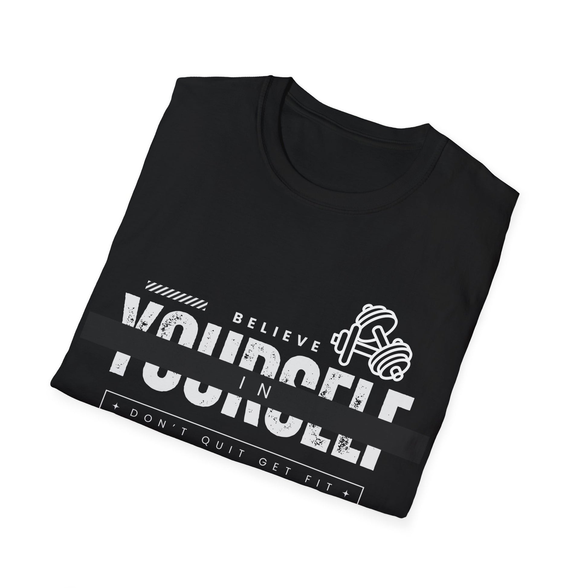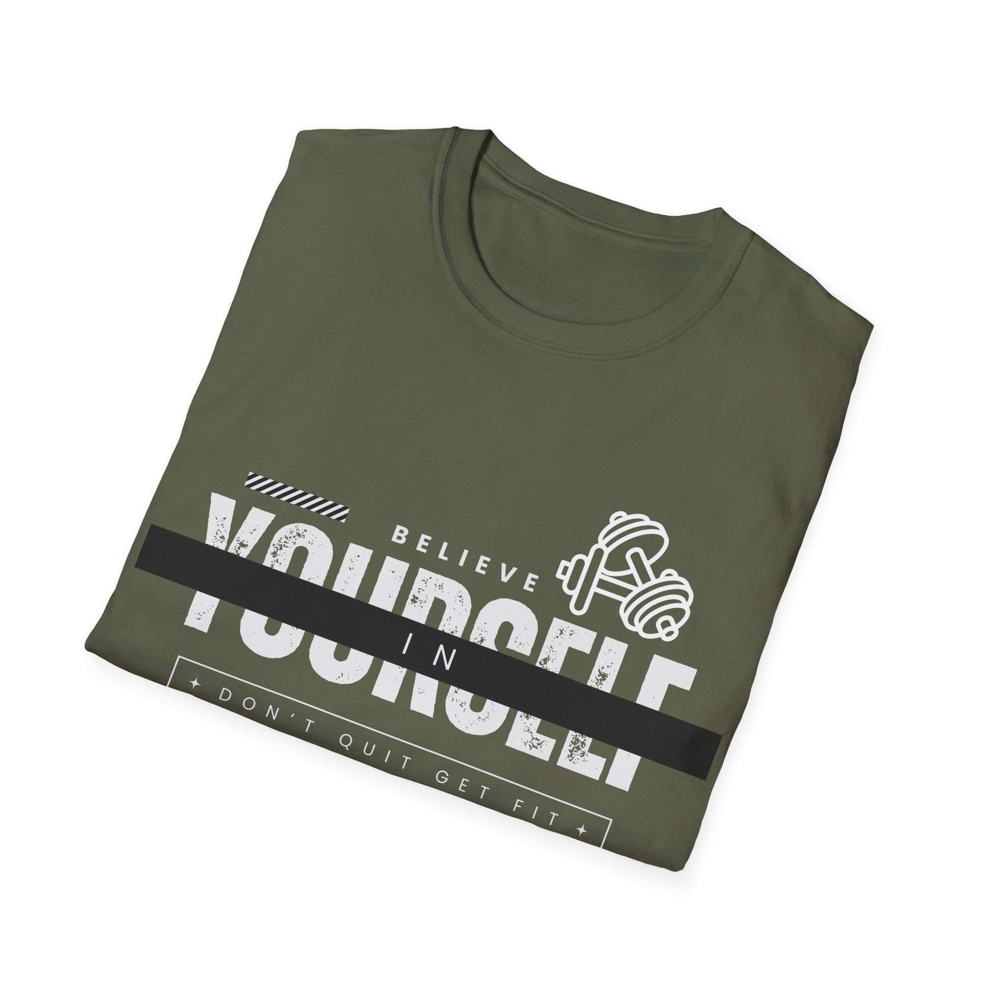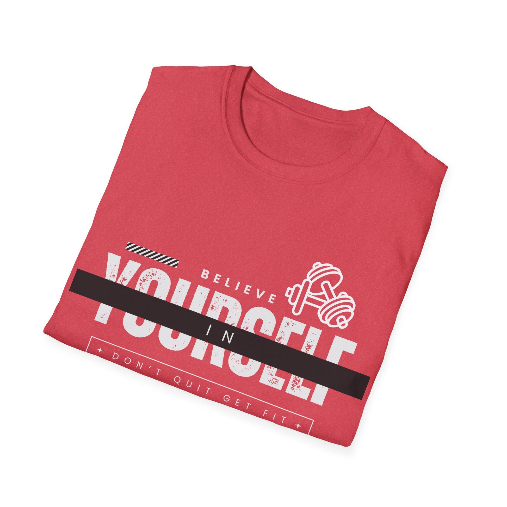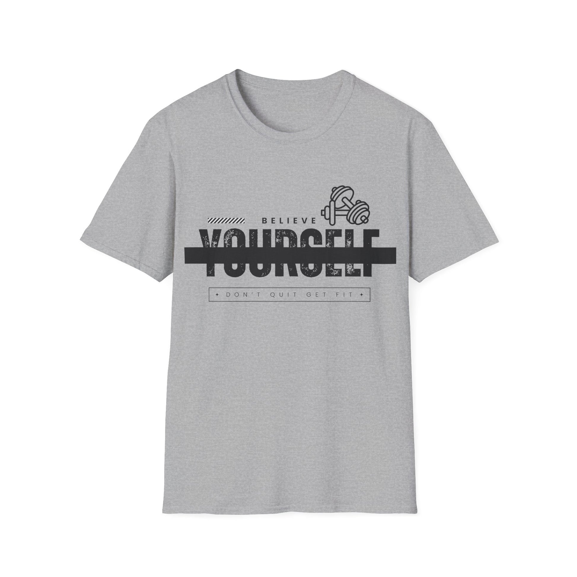 A captivating gym t-shirt with the motivational words: 'Believe in Yourself', encouraging you to keep on with the workouts.