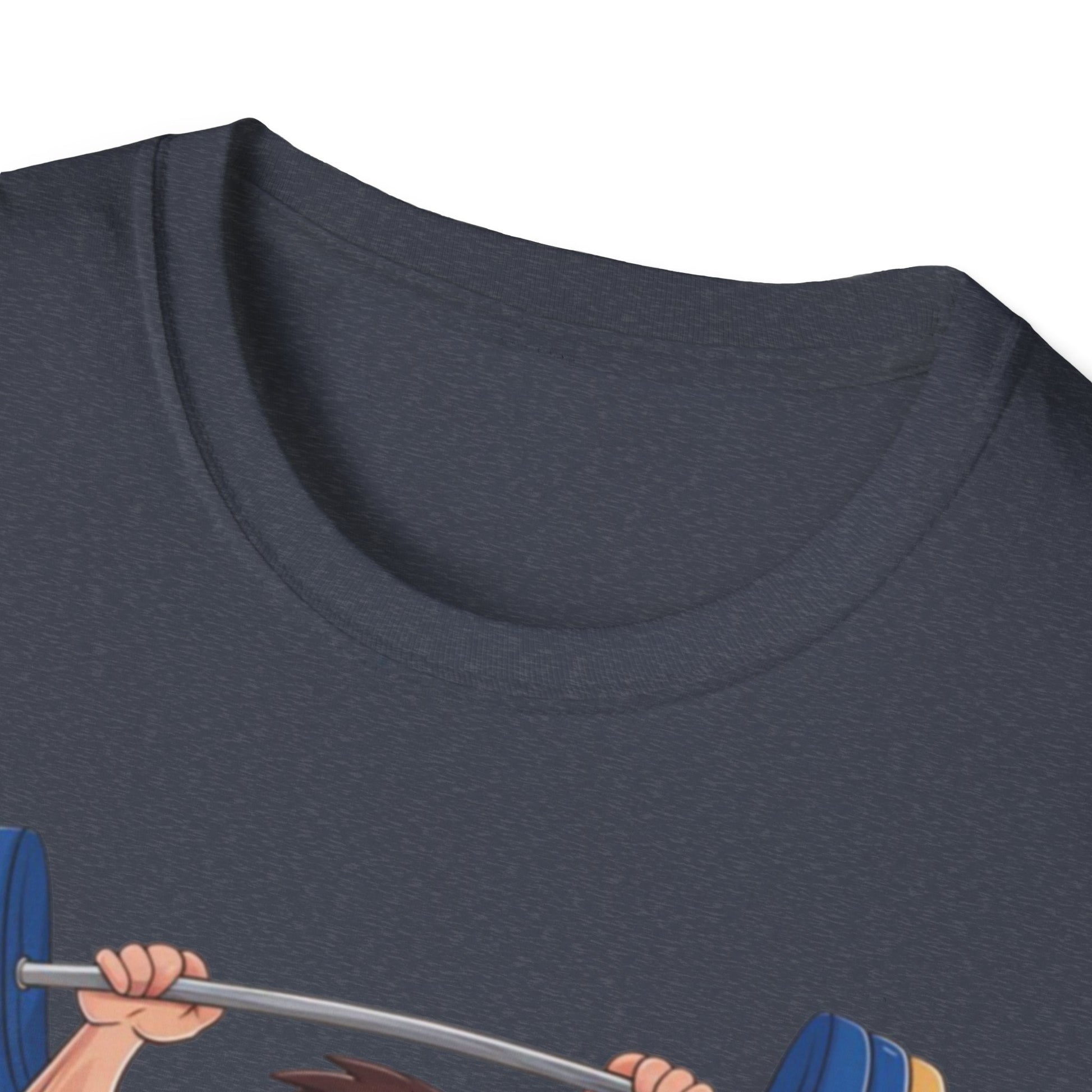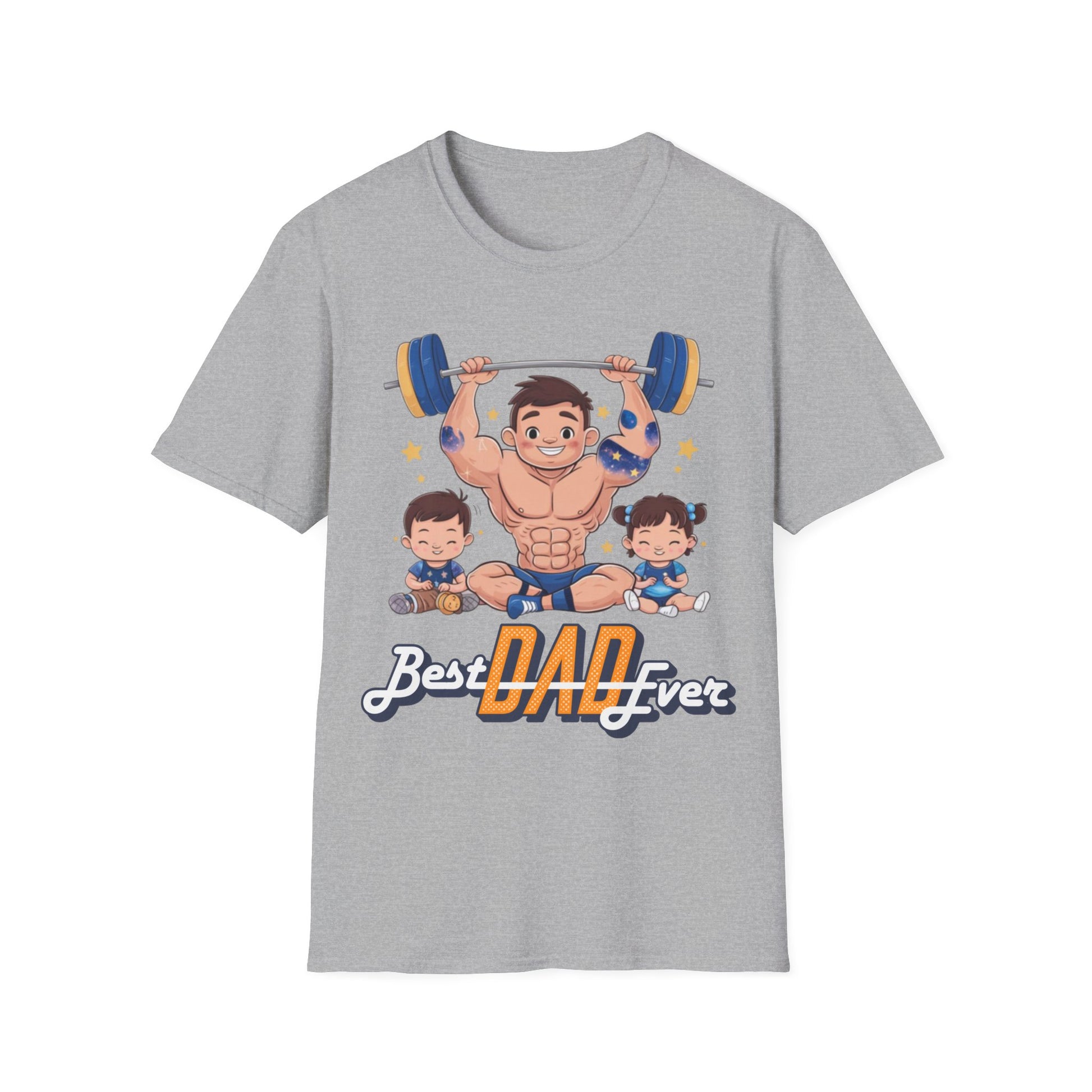 Cartoon galaxy style art gym t-shirt illustration of a rear view of a man holding a barbell high with weights and a young son seated on one side and a young daughter seated on the other side.
