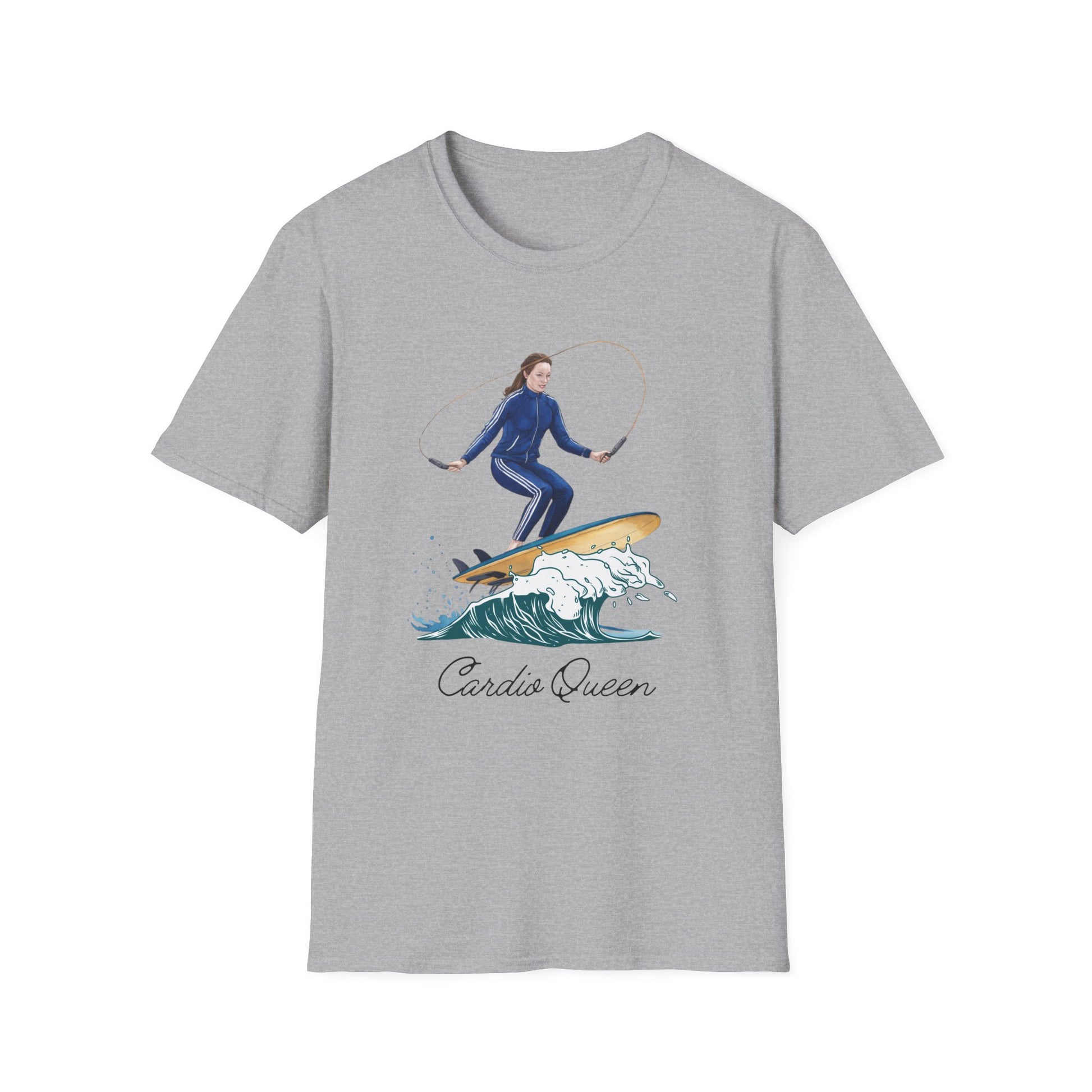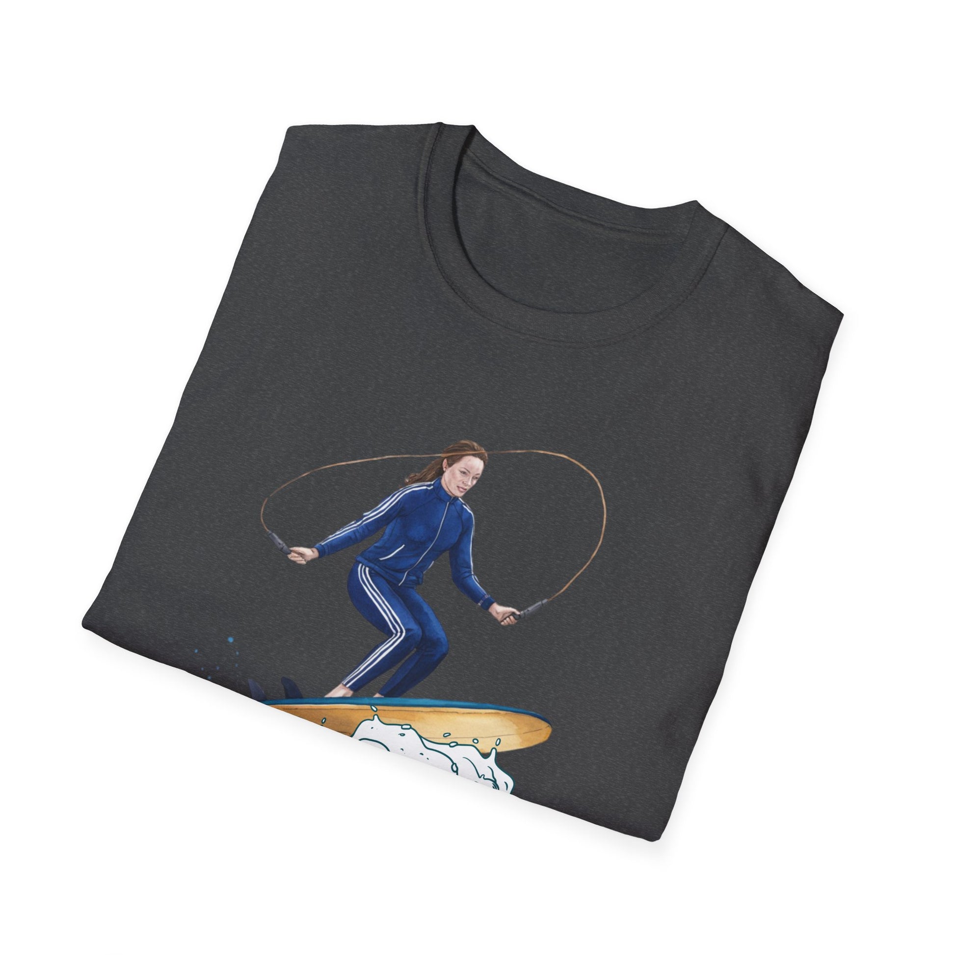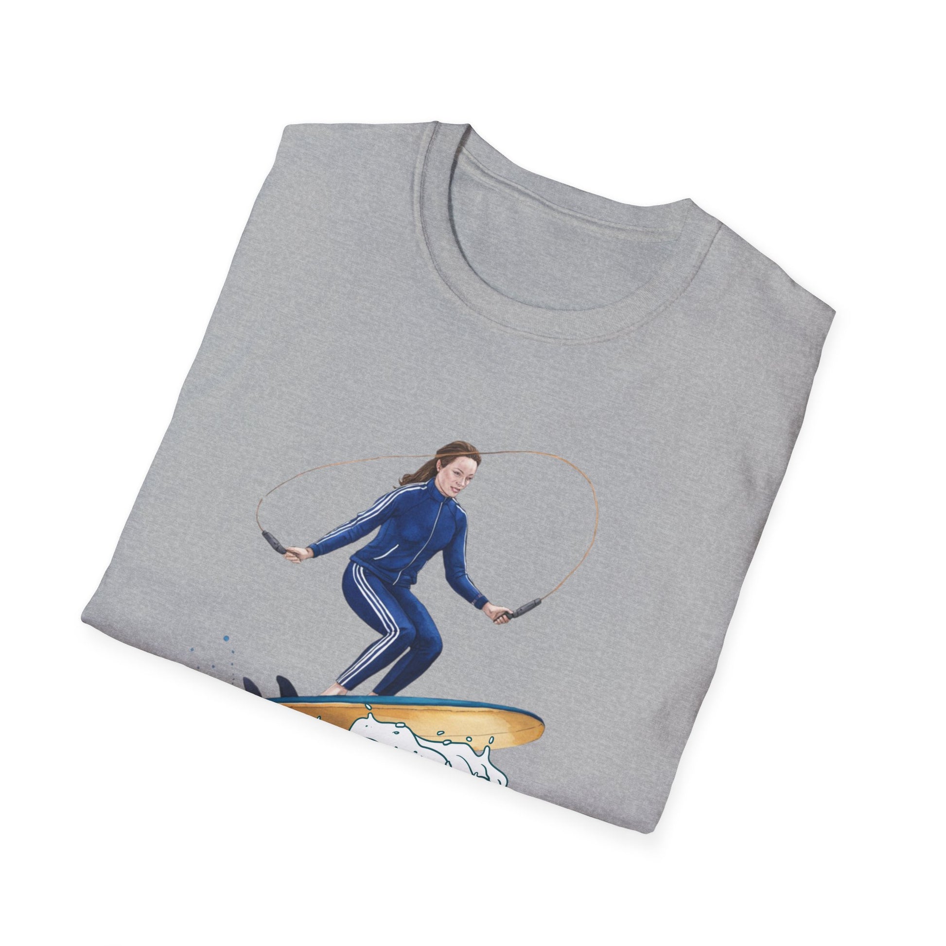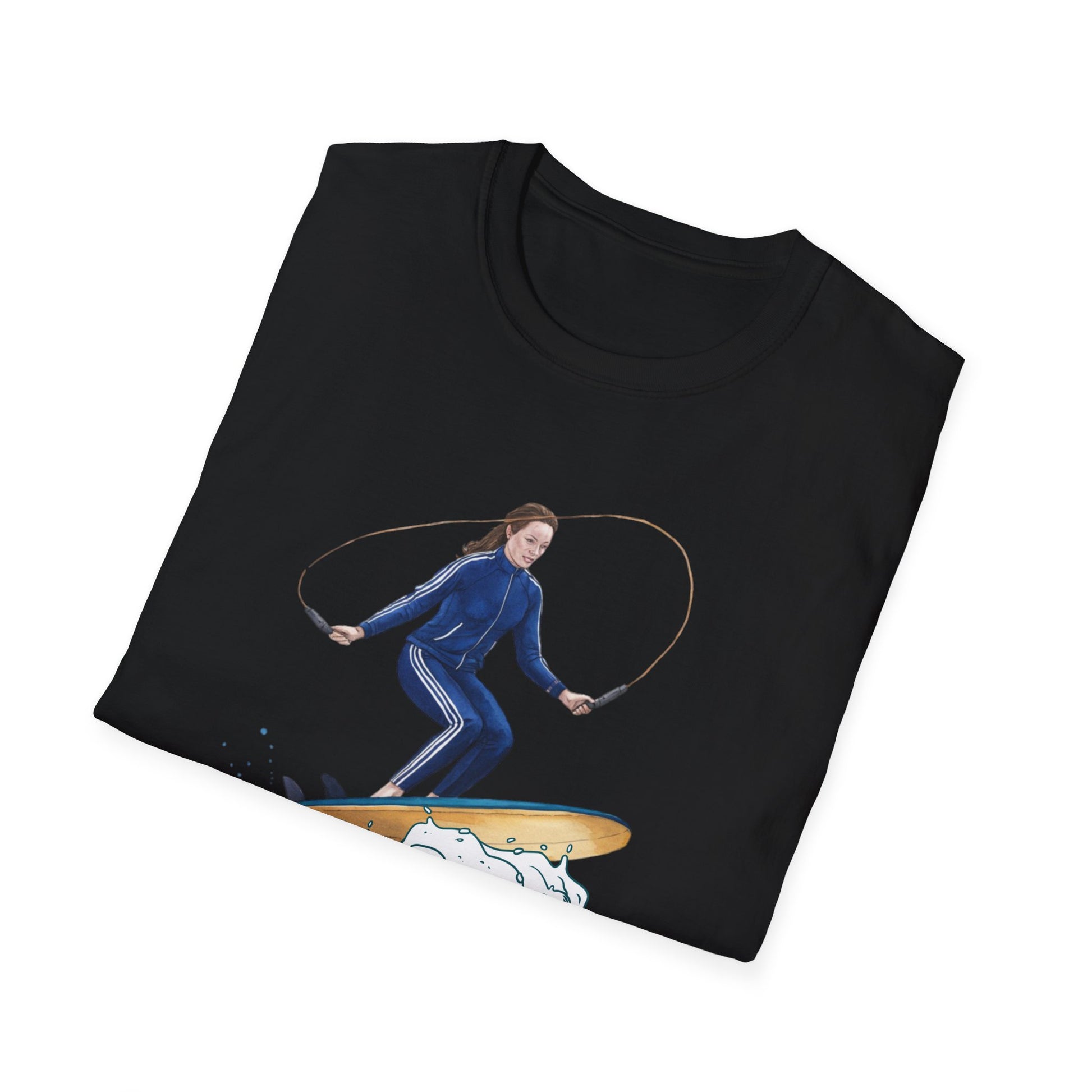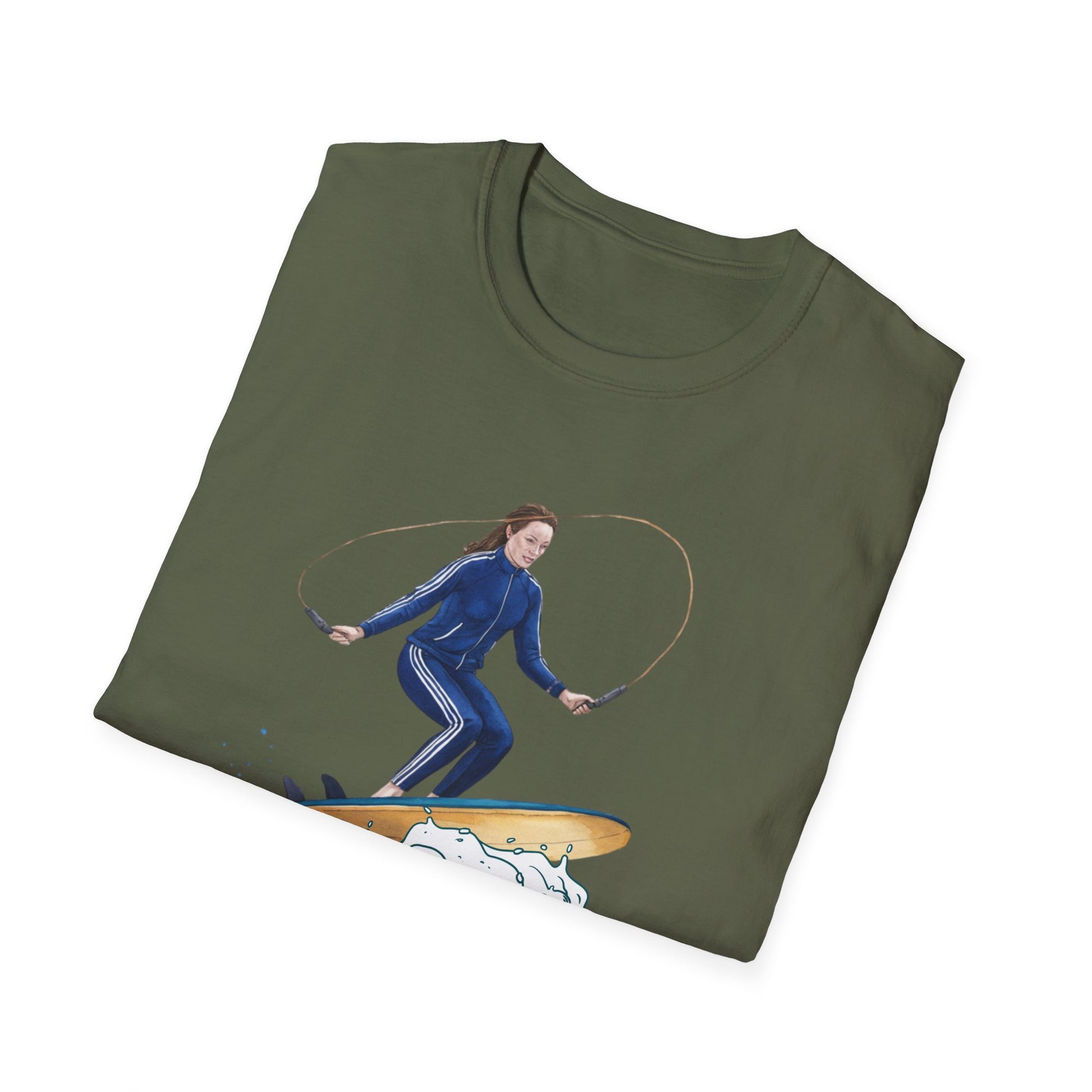 Watercolor gym t-shirt illustration of a lady in a track suit riding a surfboard while skipping a rope, the surfboard is in the air without water and without a sea under it.