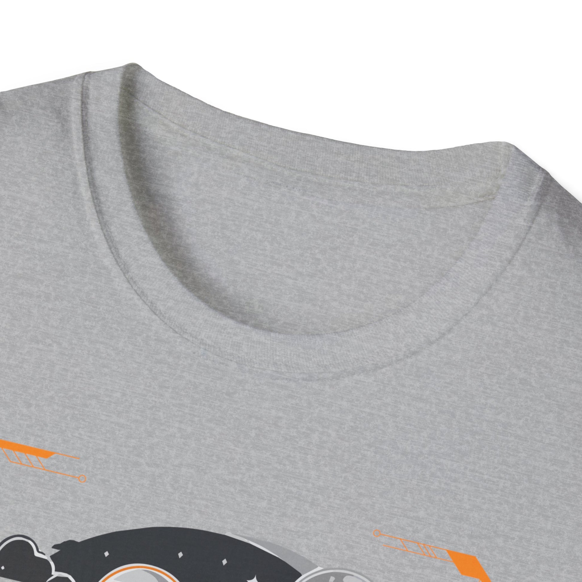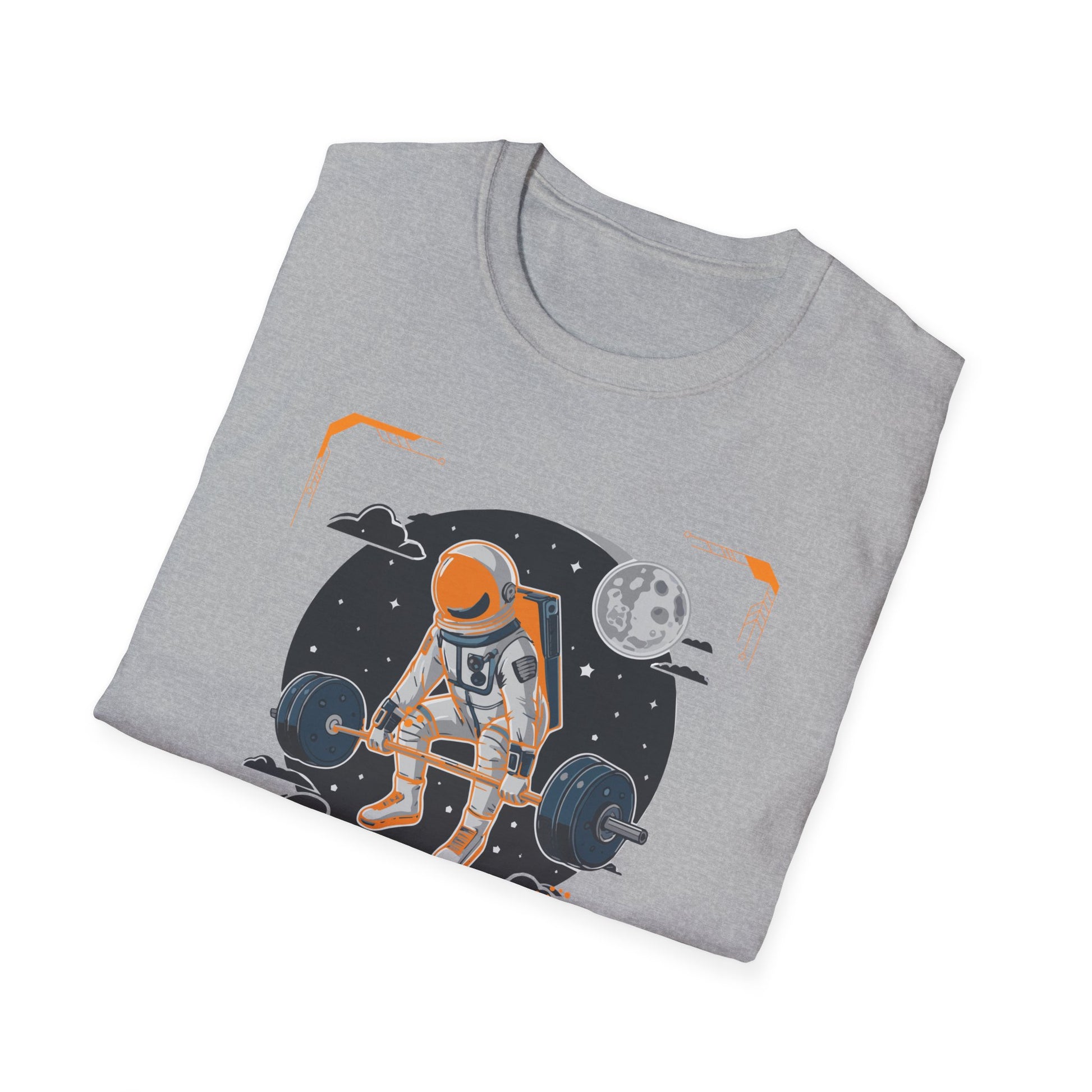 Vector art t-shirt illustration of a man in a space suit lifting a gym barbell in mid-air in the sky, with stars and the moon in the setting, doing a dead-lift with a barbell, on a t-shirt background