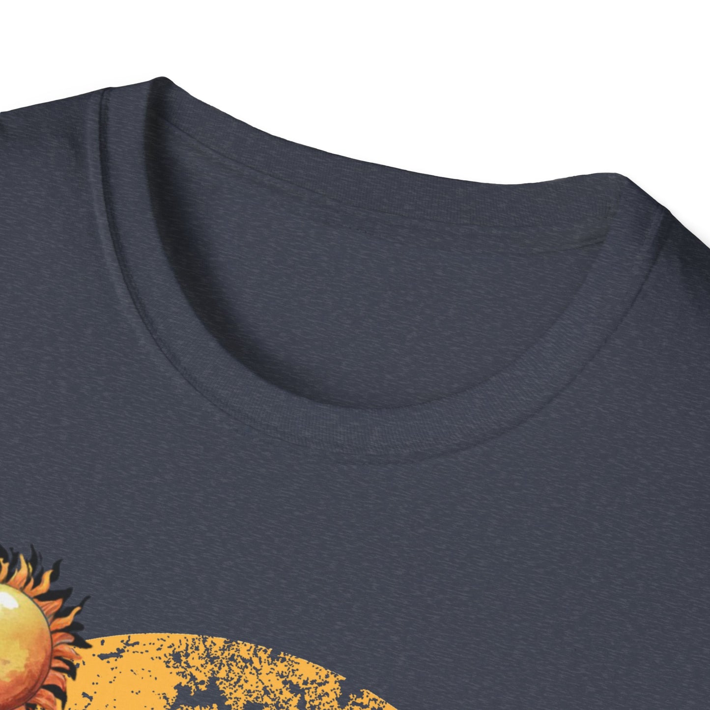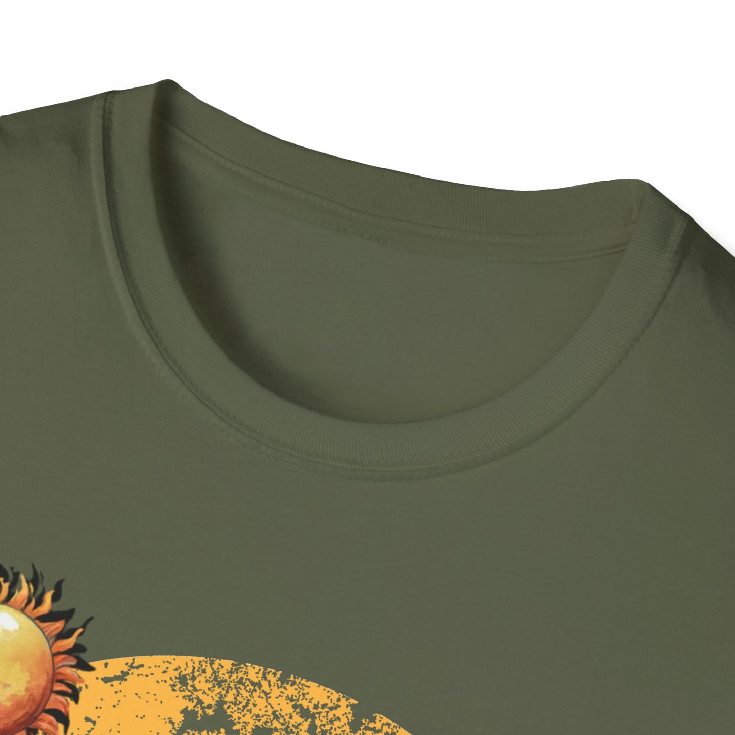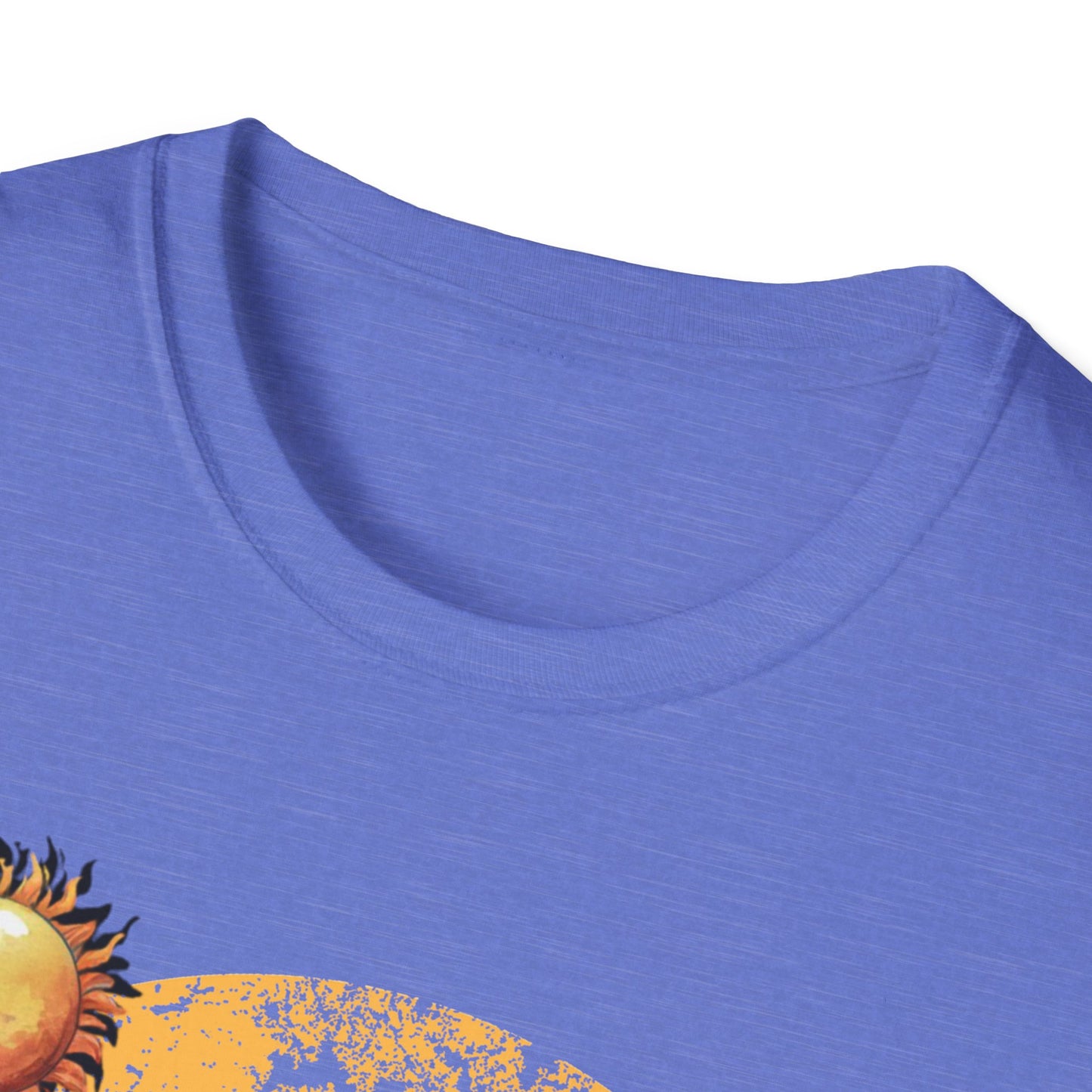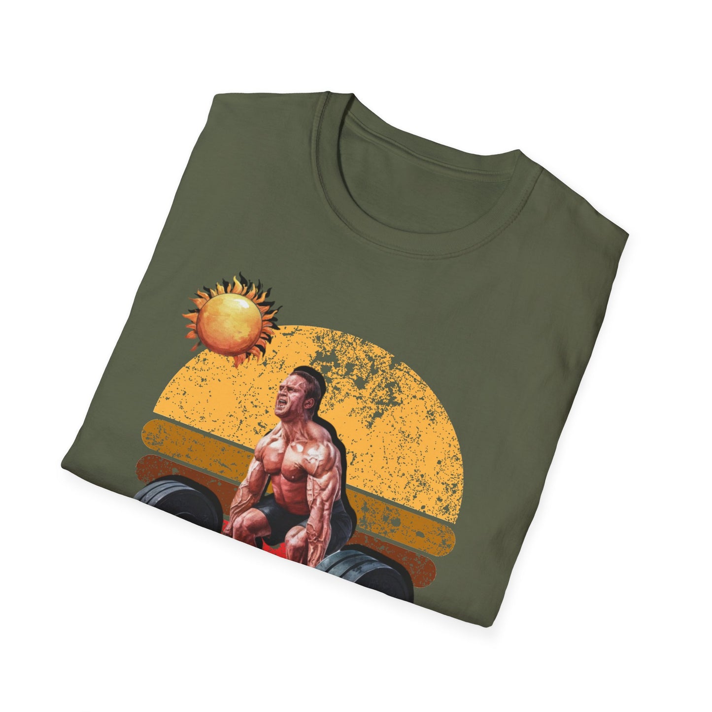 A captivating watercolor gym t-shirt illustration featuring a muscular man executing a deadlift with a heavily-loaded barbell on a sandy beach. The man's determined expression and veins bulging showcase his strength. The background is a stunning ocean without a sky, with waves crashing against the sand. A vivid illustrated sun floats in the air, casting golden rays on the scenery. A palm tree stands tall, adding a touch of tropical paradise to this powerful scene.