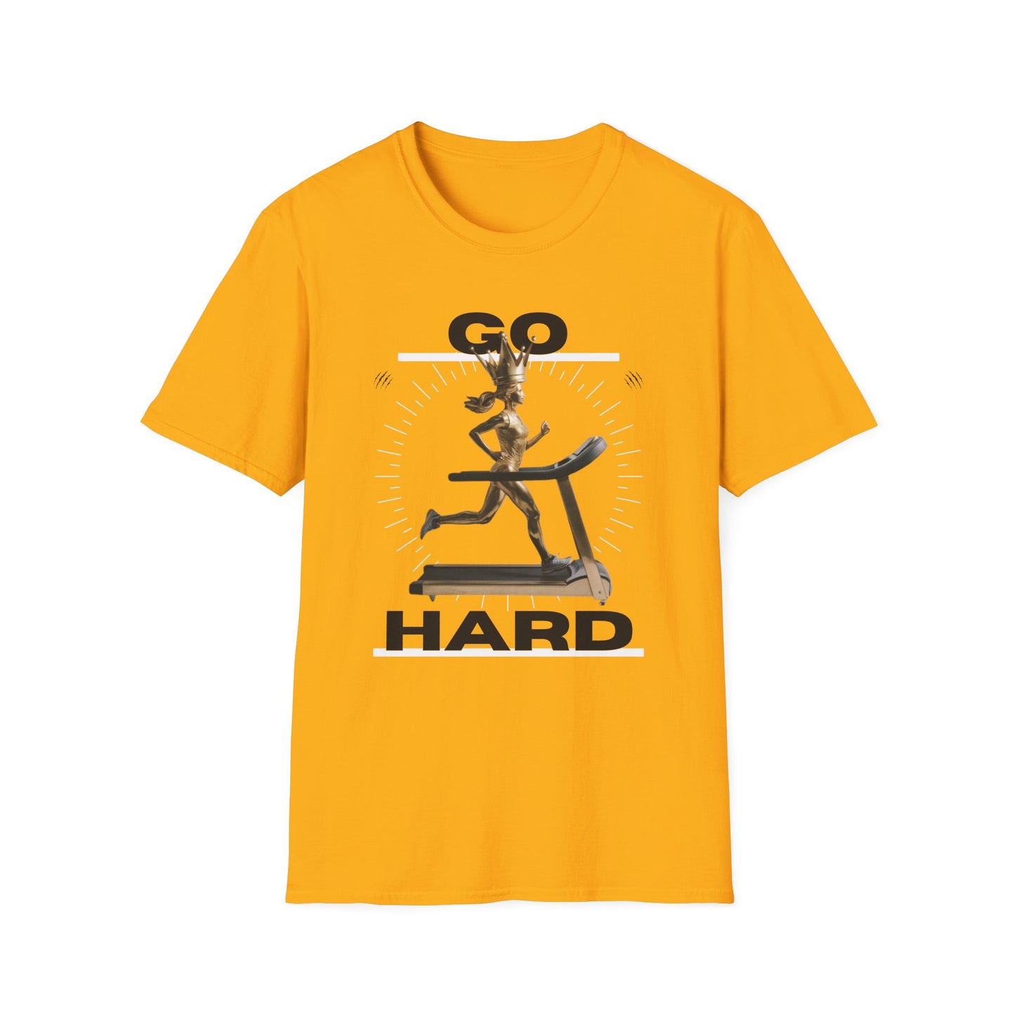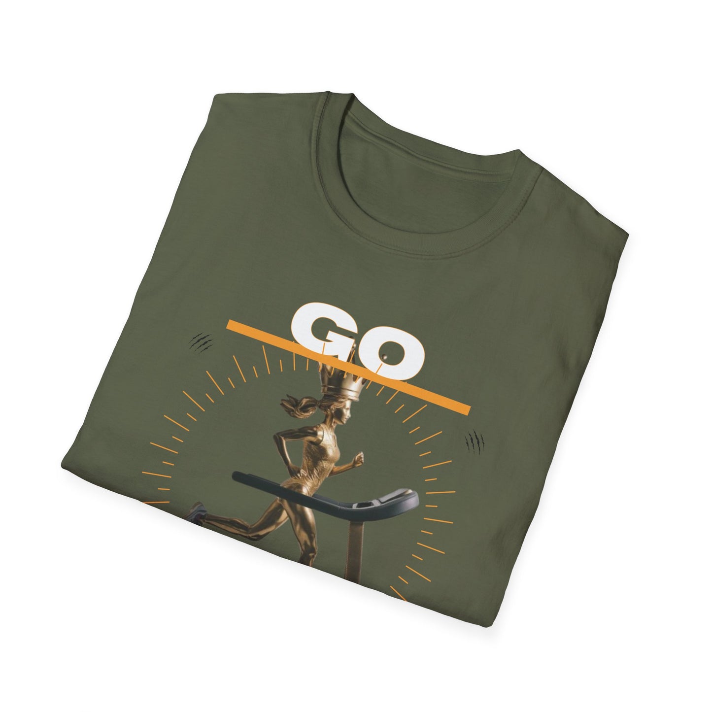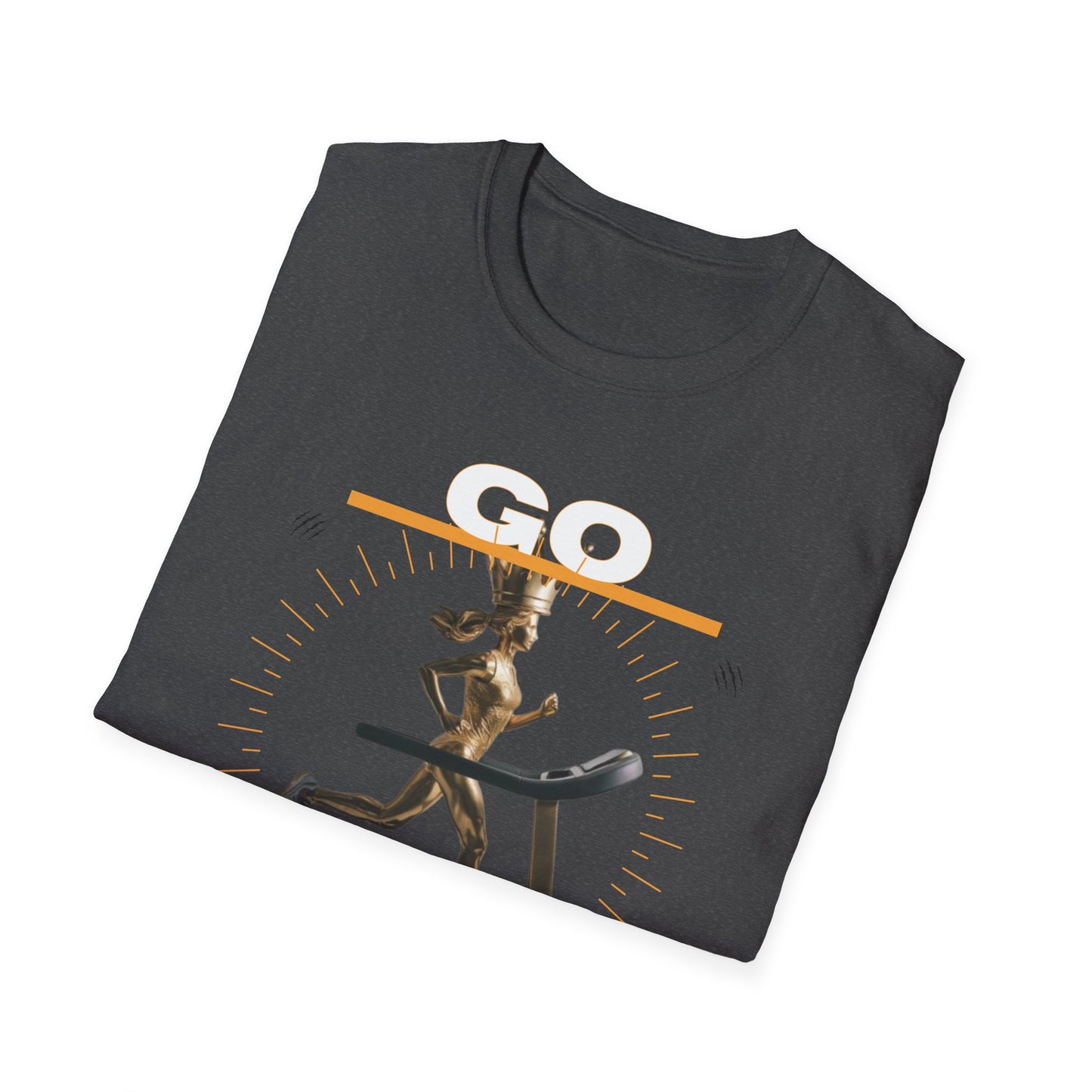 A golden sculpture t-shirt illustration of a lady running on a treadmill with a large queen crown on her head on a t-shirt background