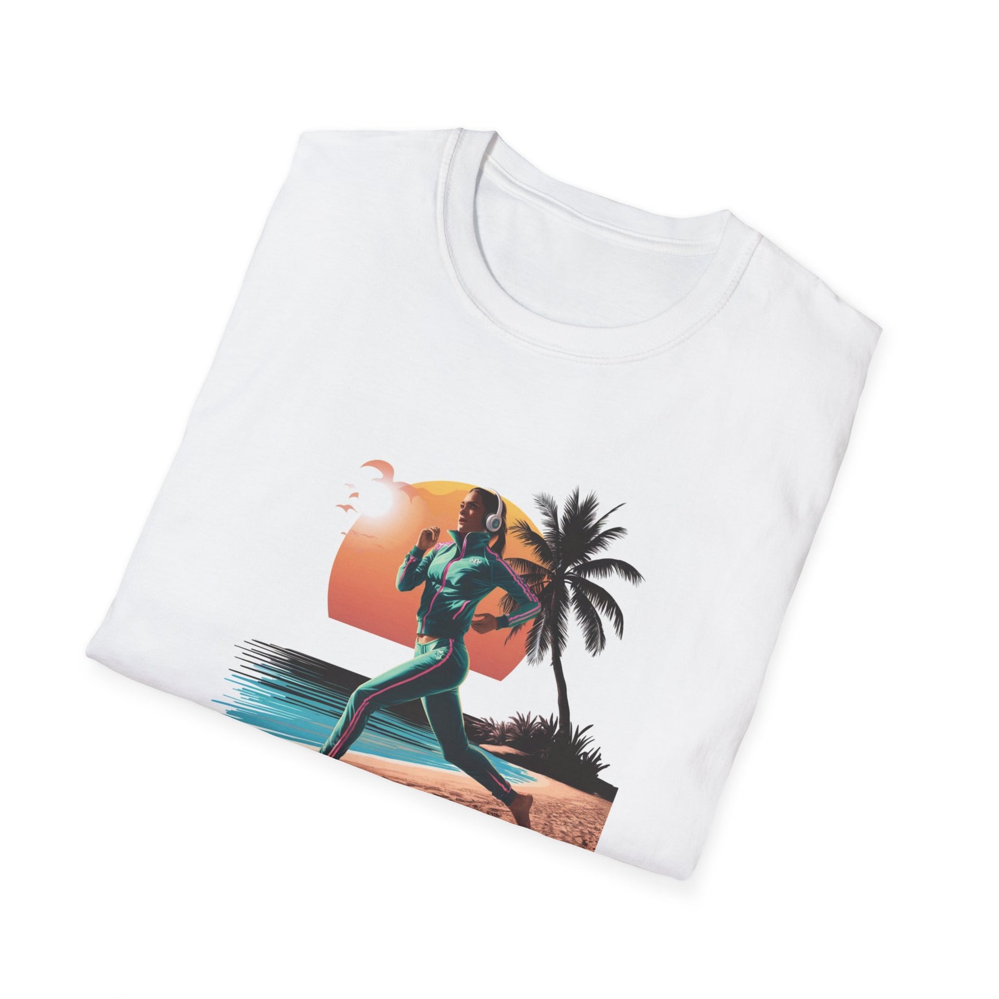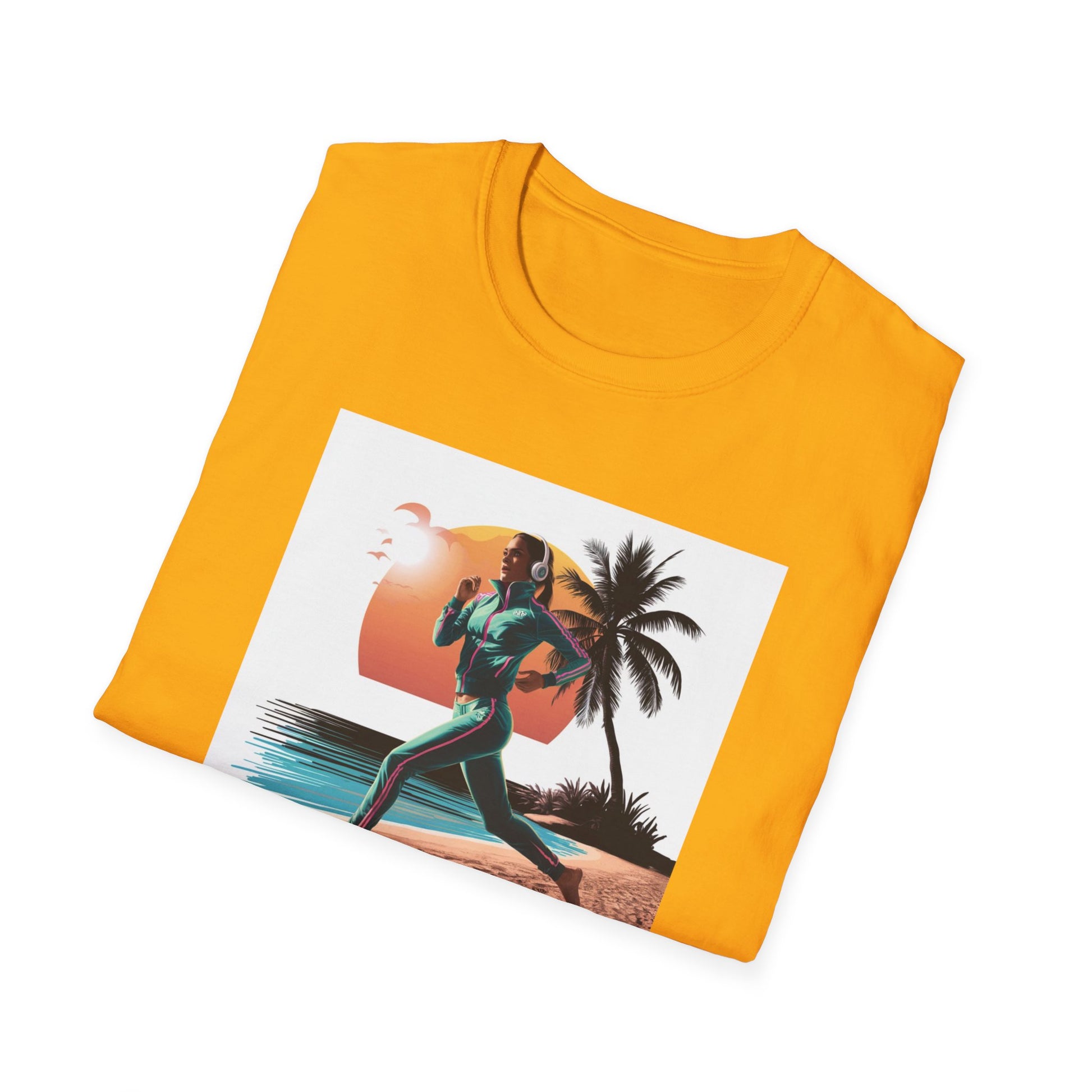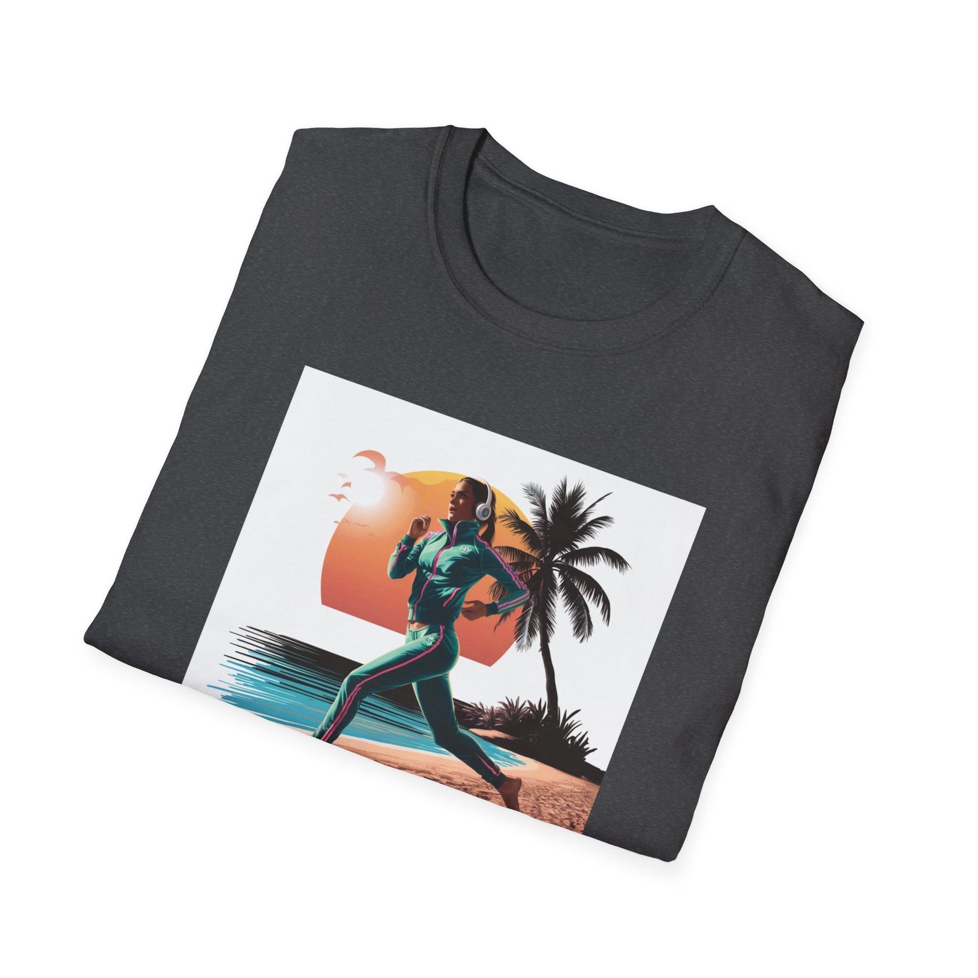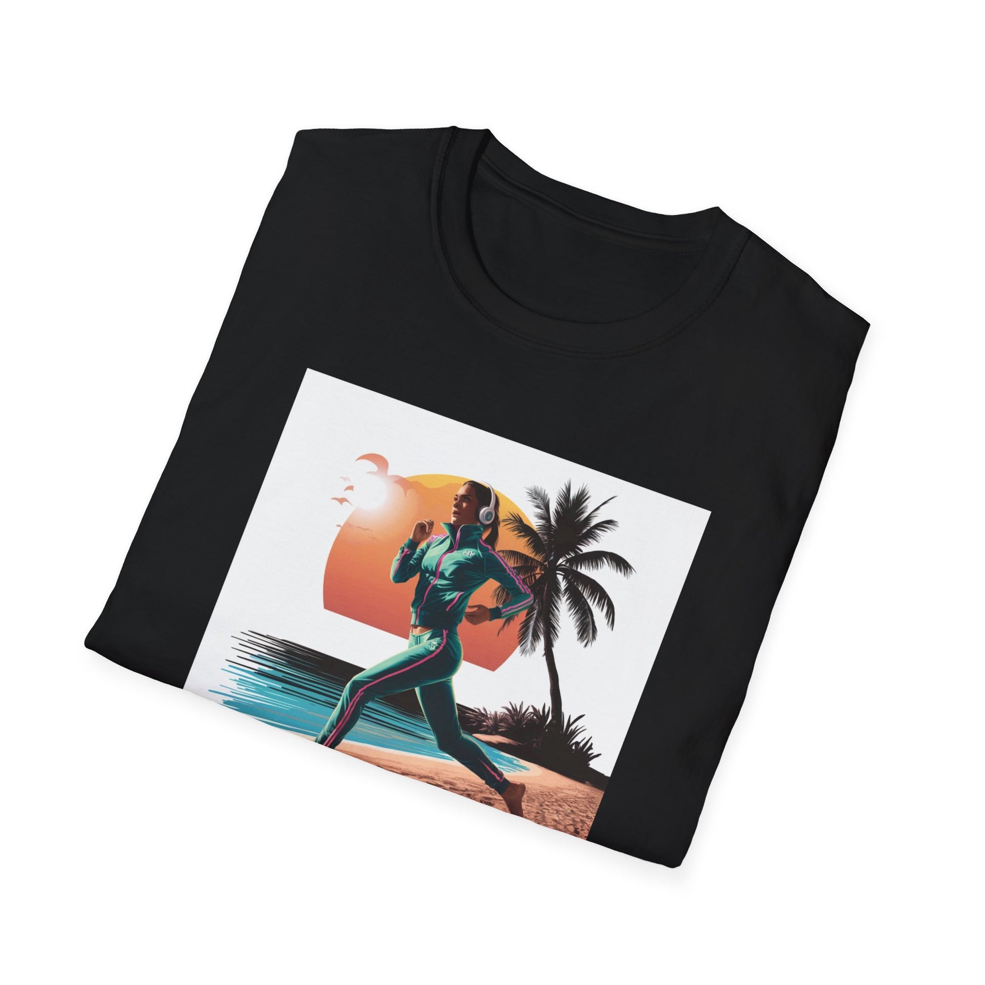 Vector art gym t-shirt illustration of a lady running with headphones on her head and ears, dressed in a track suit, on sandy beach in a tropical setting with the sun in the air but no sky and a palm tree can be seen in the tropical setting.