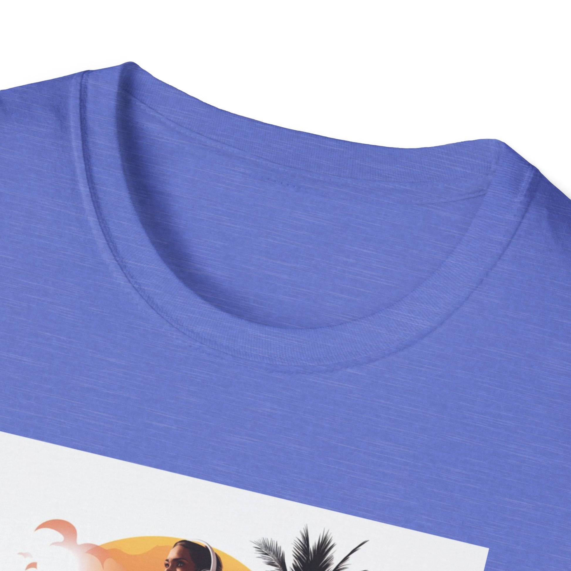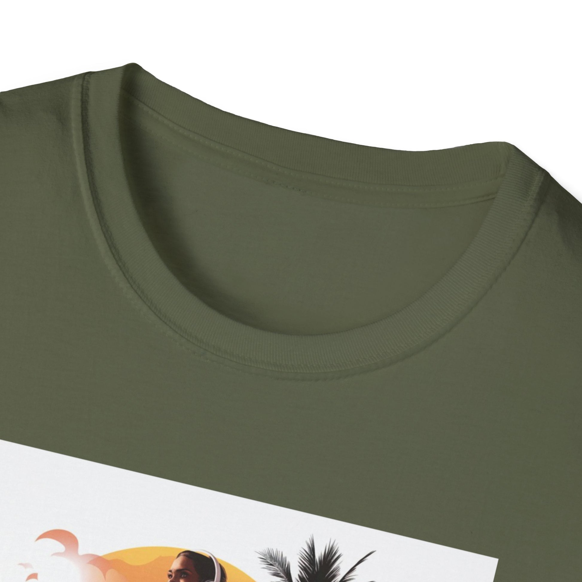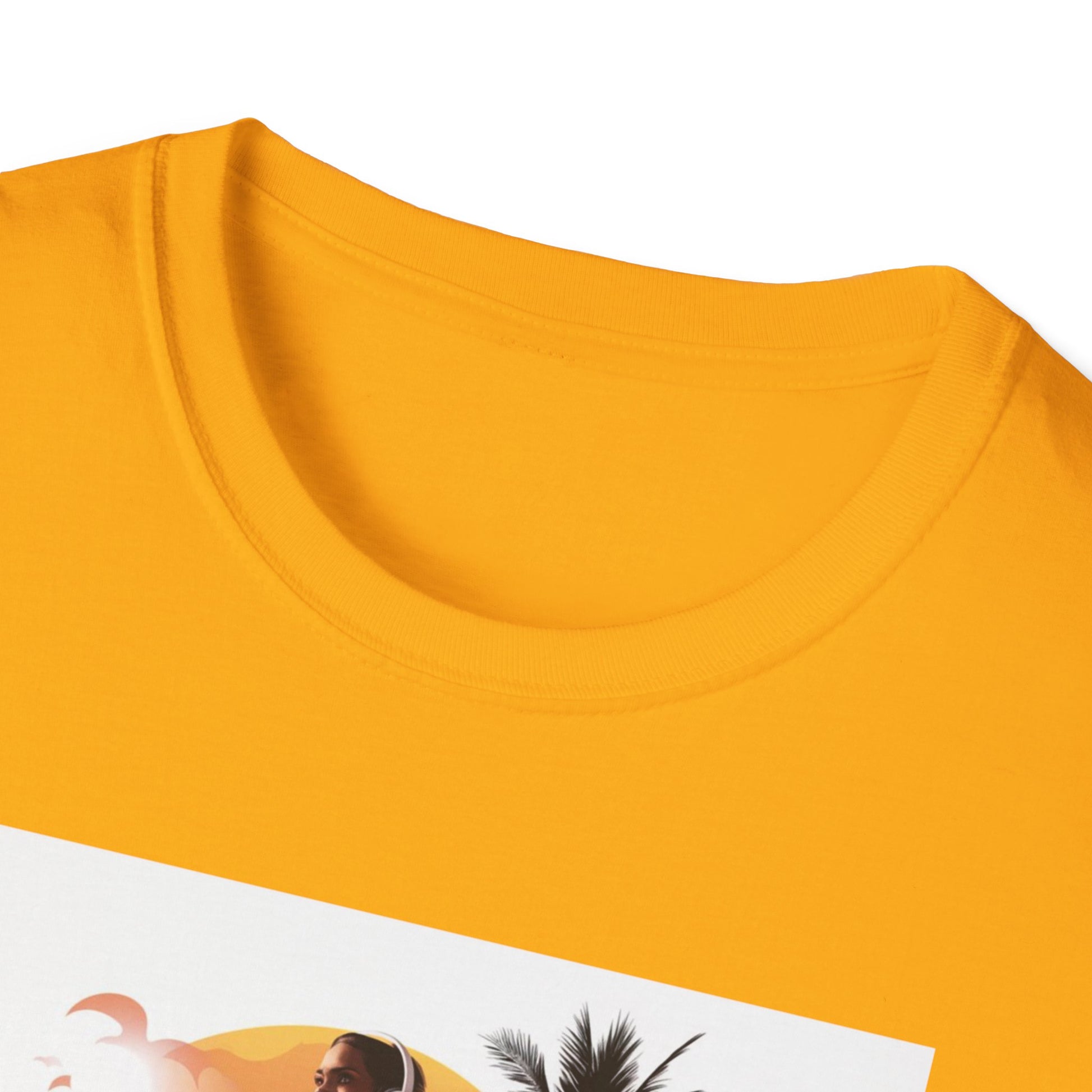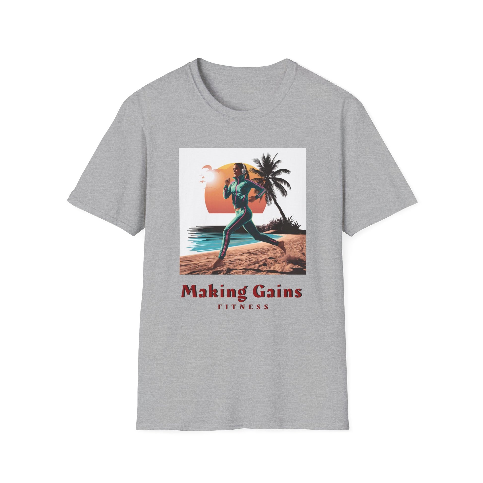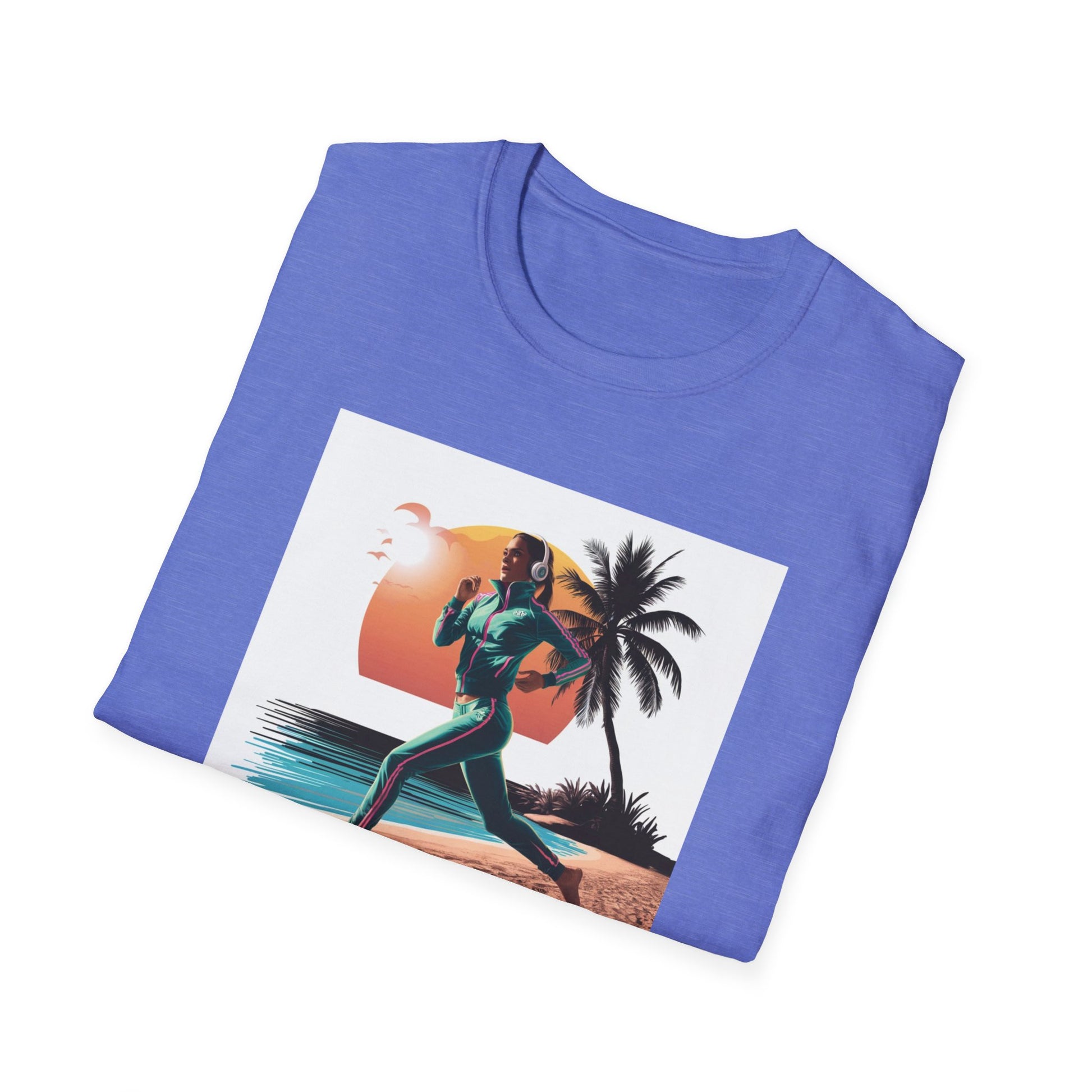 Vector art gym t-shirt illustration of a lady running with headphones on her head and ears, dressed in a track suit, on sandy beach in a tropical setting with the sun in the air but no sky and a palm tree can be seen in the tropical setting.