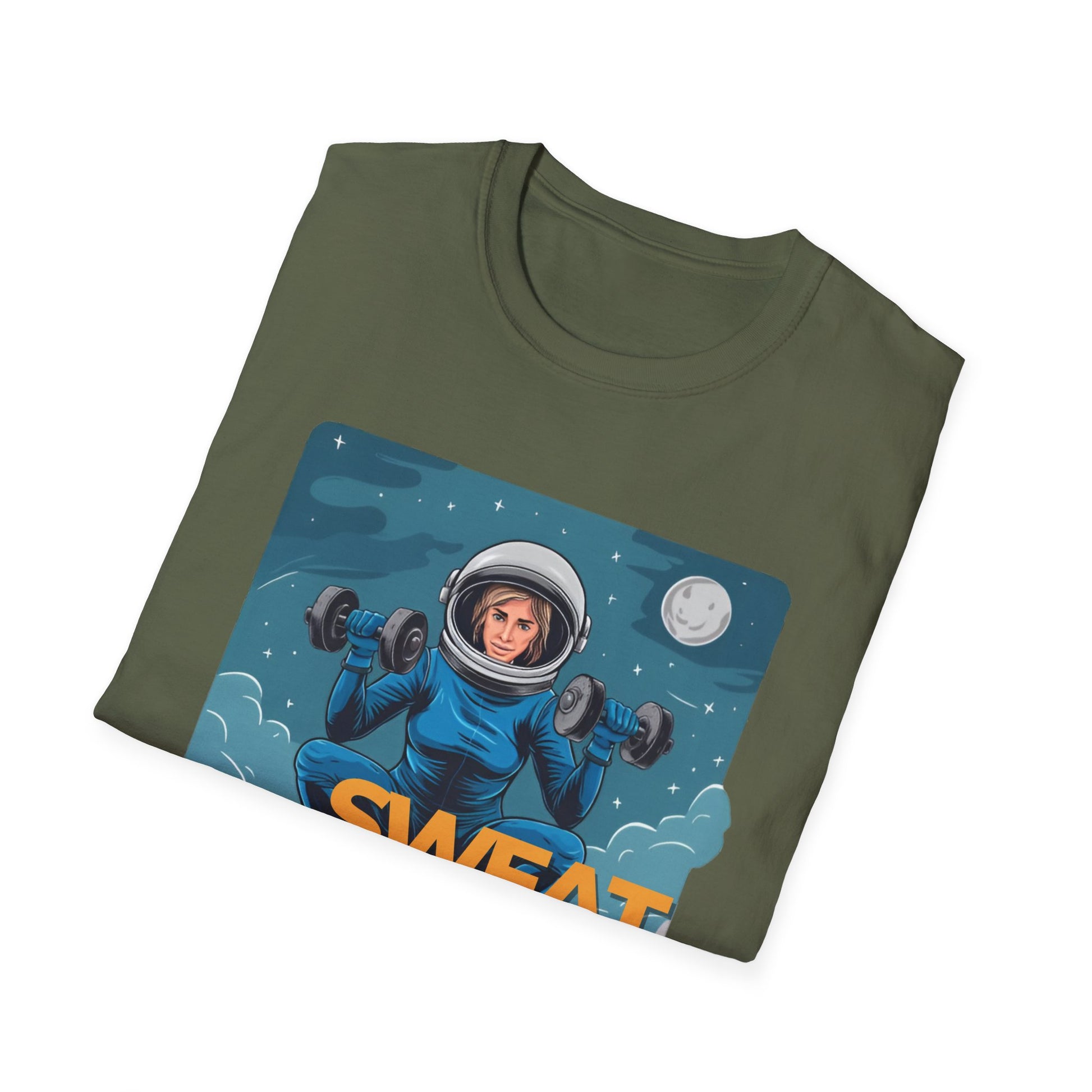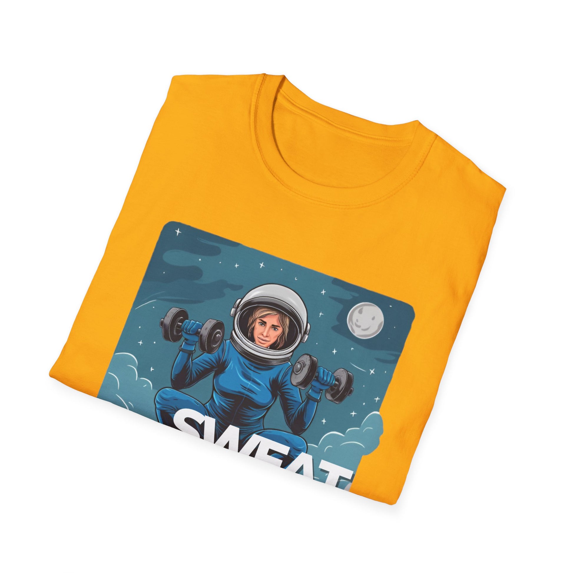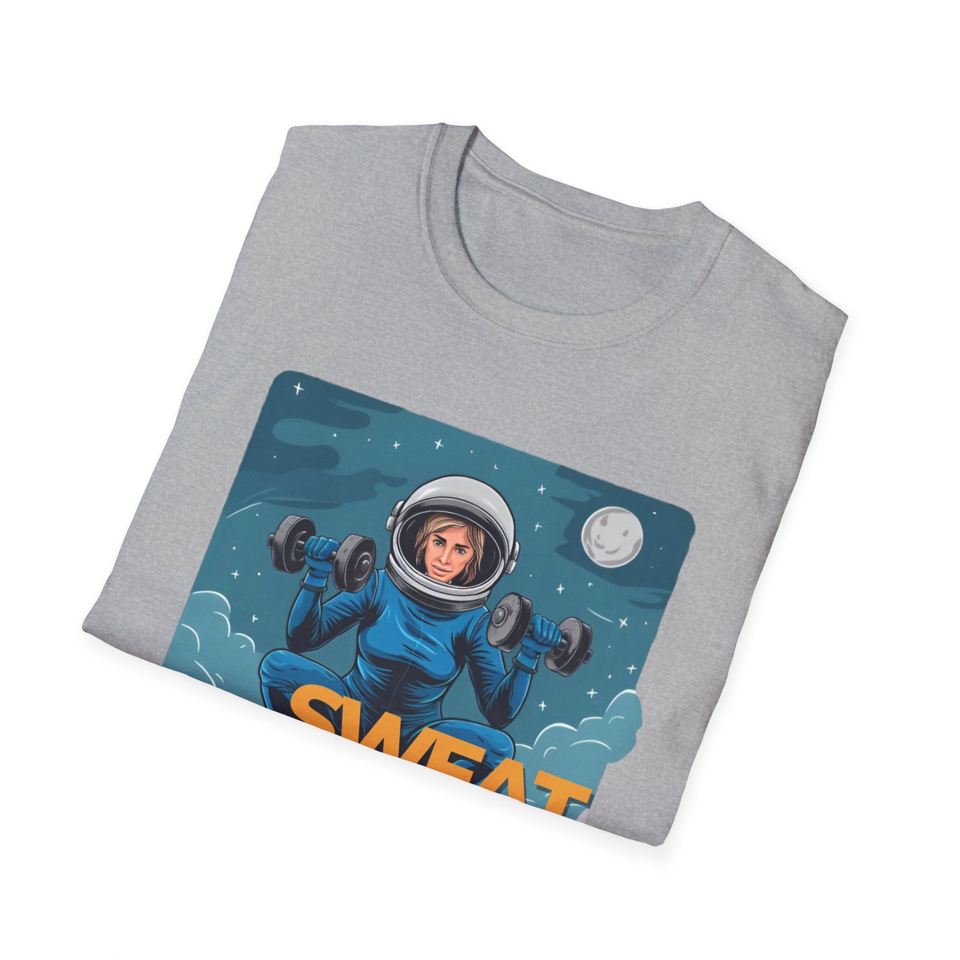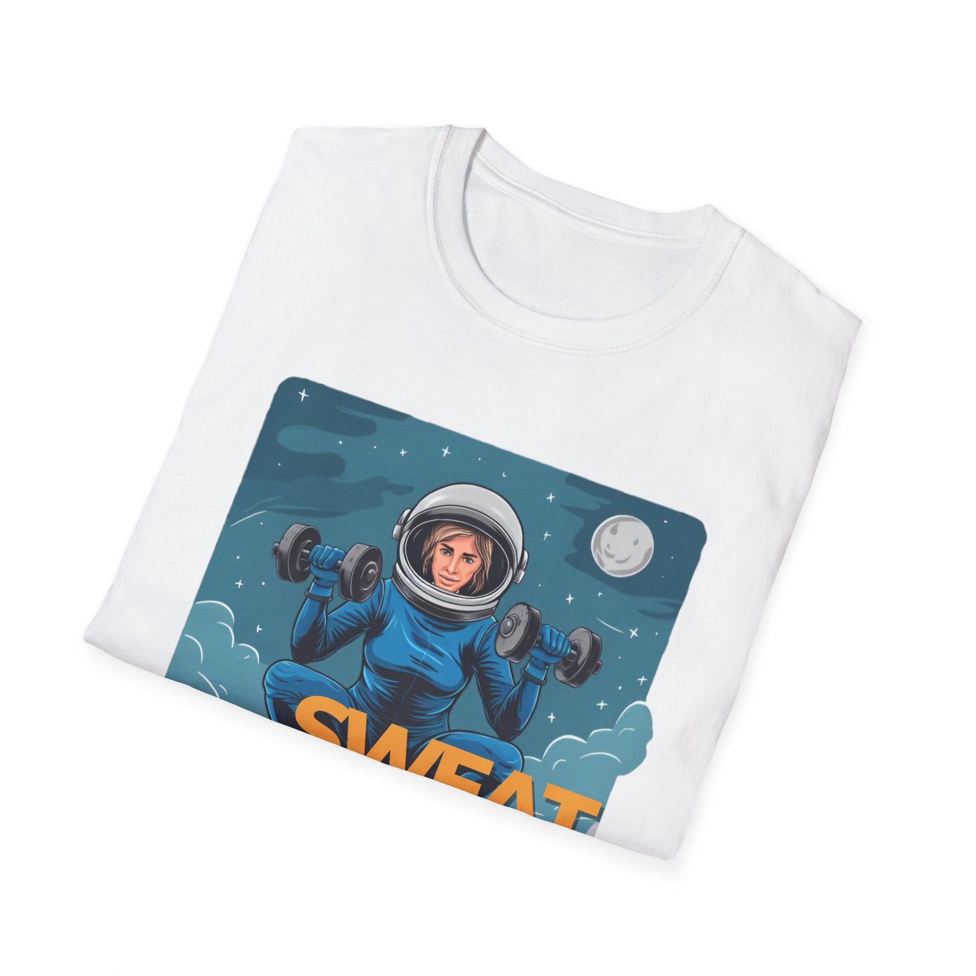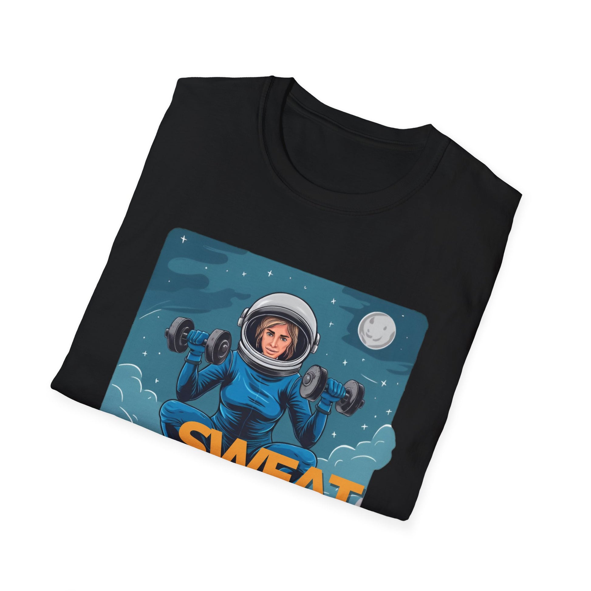 Vector art gym t-shirt illustration of a lady doing a squat exercise while holding two dumbbells, in a space suit, but her head can be seen in the helmet, in mid-air in the sky, with stars and the moon in the setting, on a white background