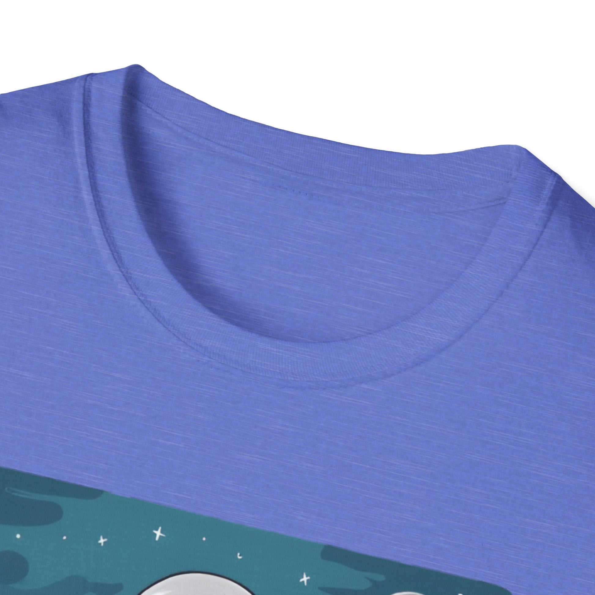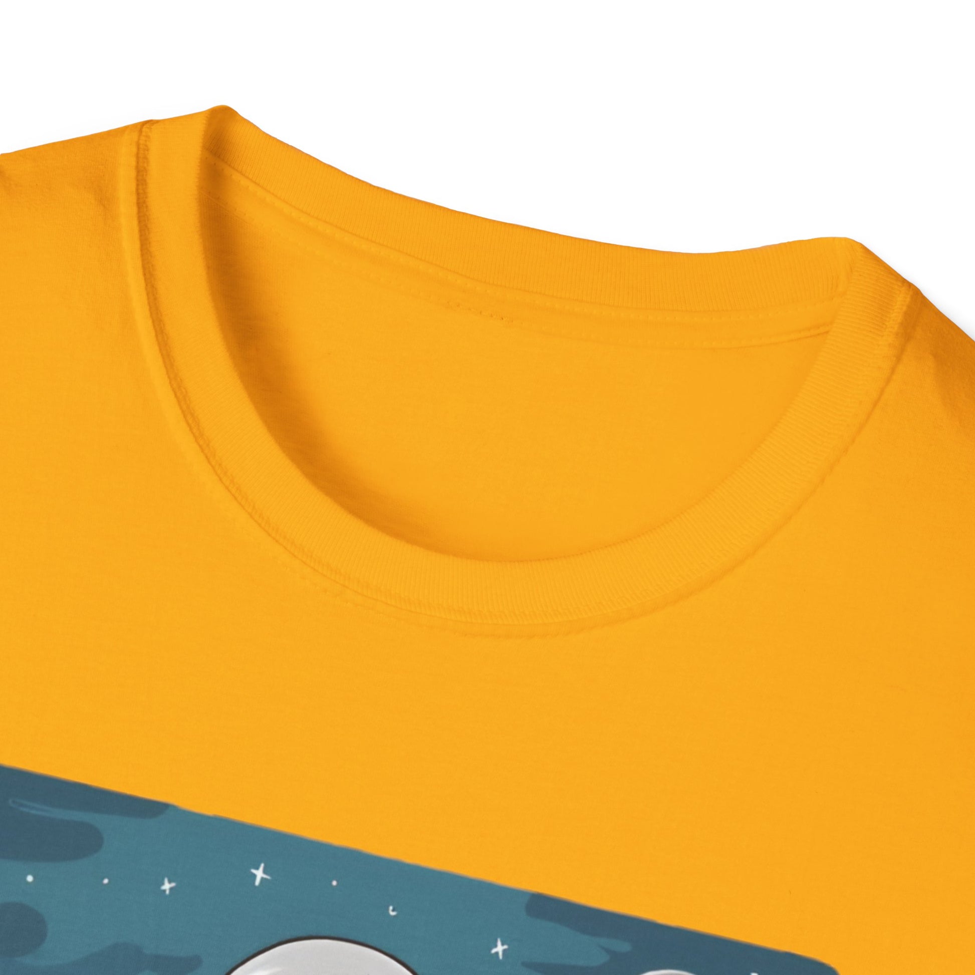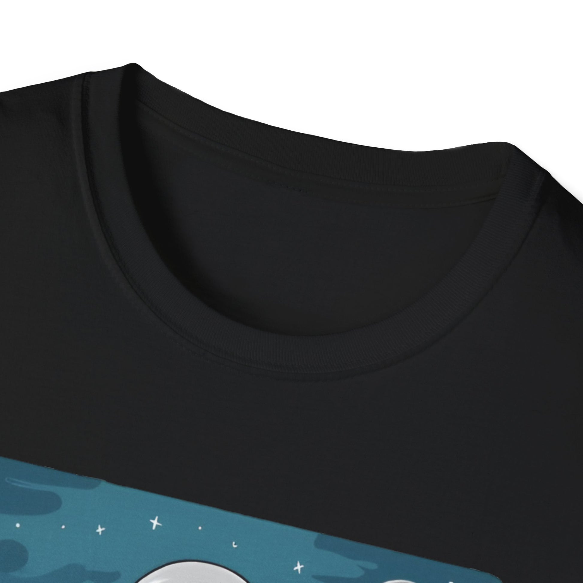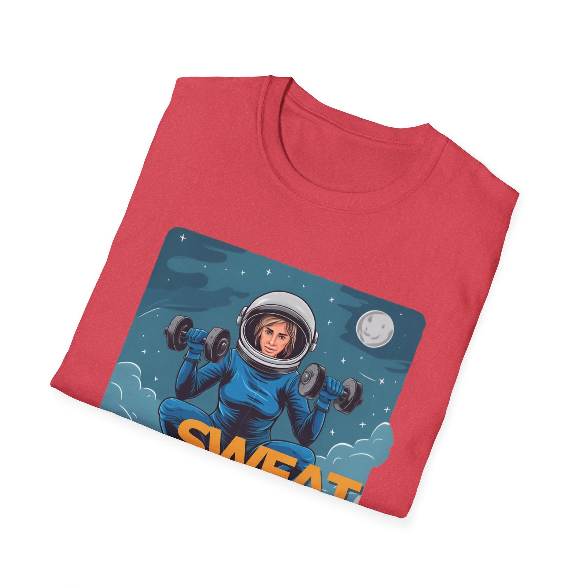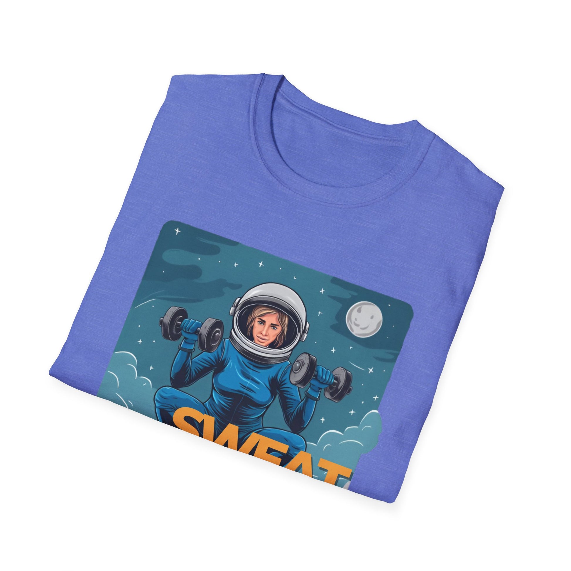 Vector art gym t-shirt illustration of a lady doing a squat exercise while holding two dumbbells, in a space suit, but her head can be seen in the helmet, in mid-air in the sky, with stars and the moon in the setting, on a white background