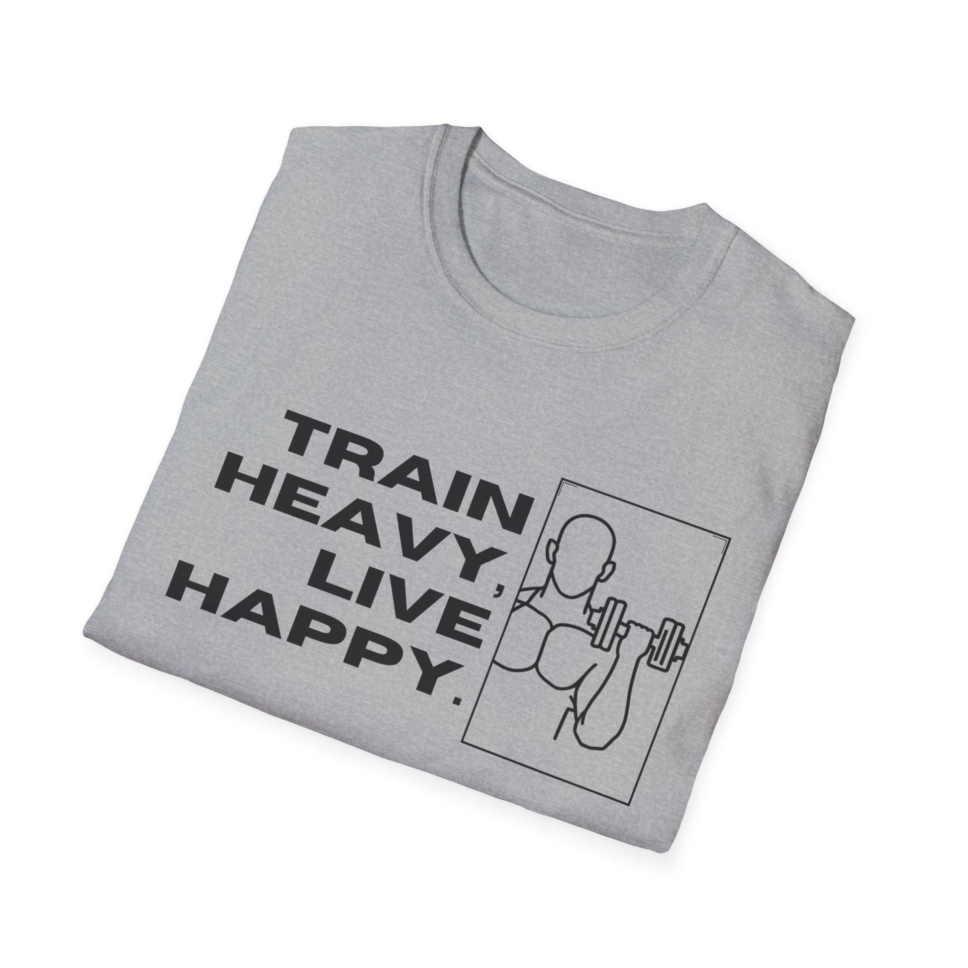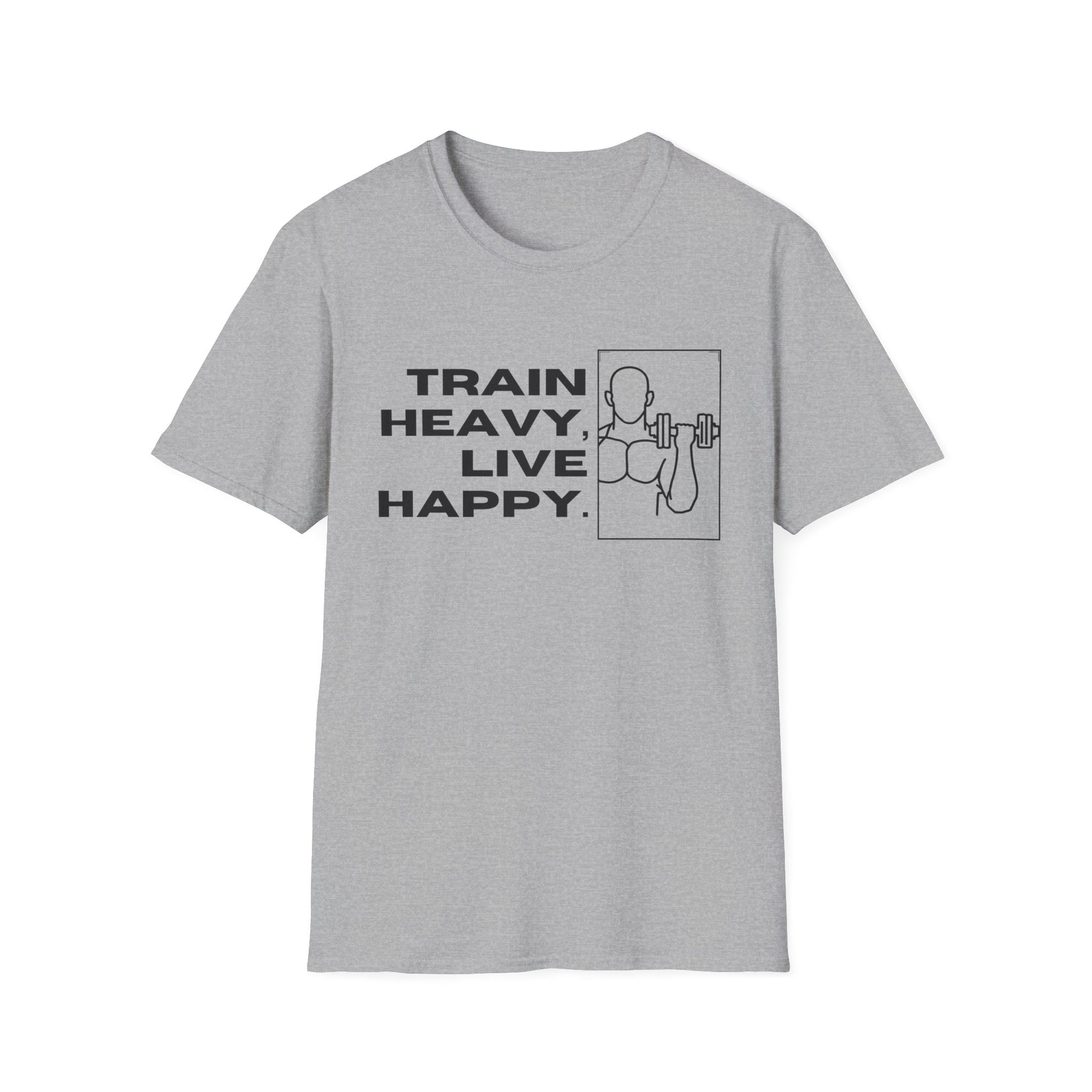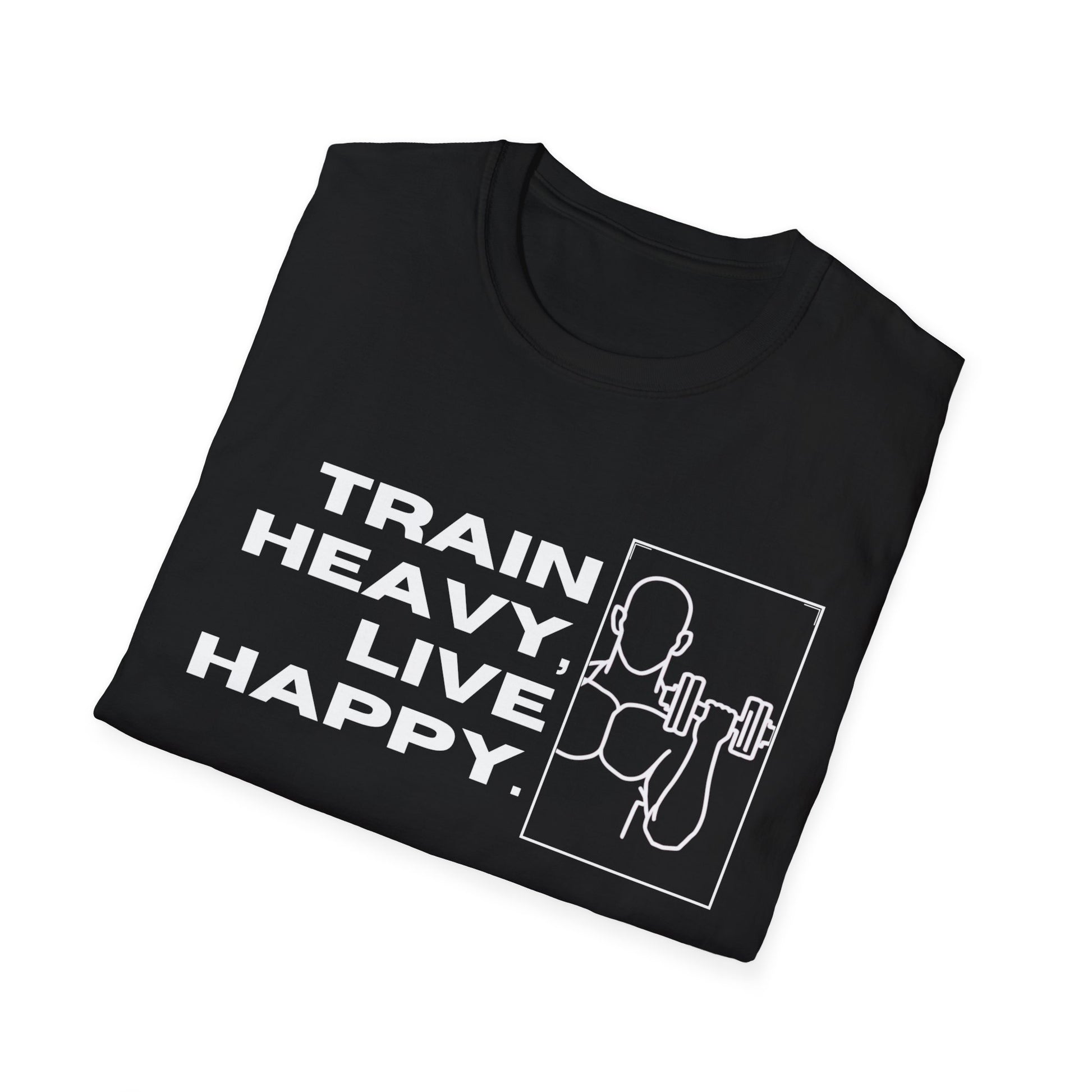 A gym t-shirt illustration with the motivational words 'Train Heavy Live Happy'