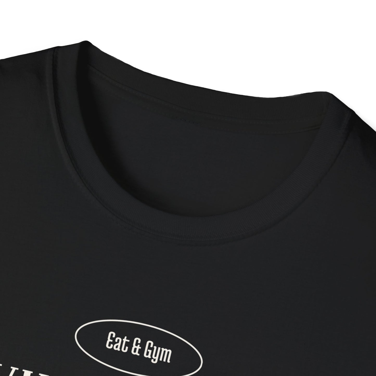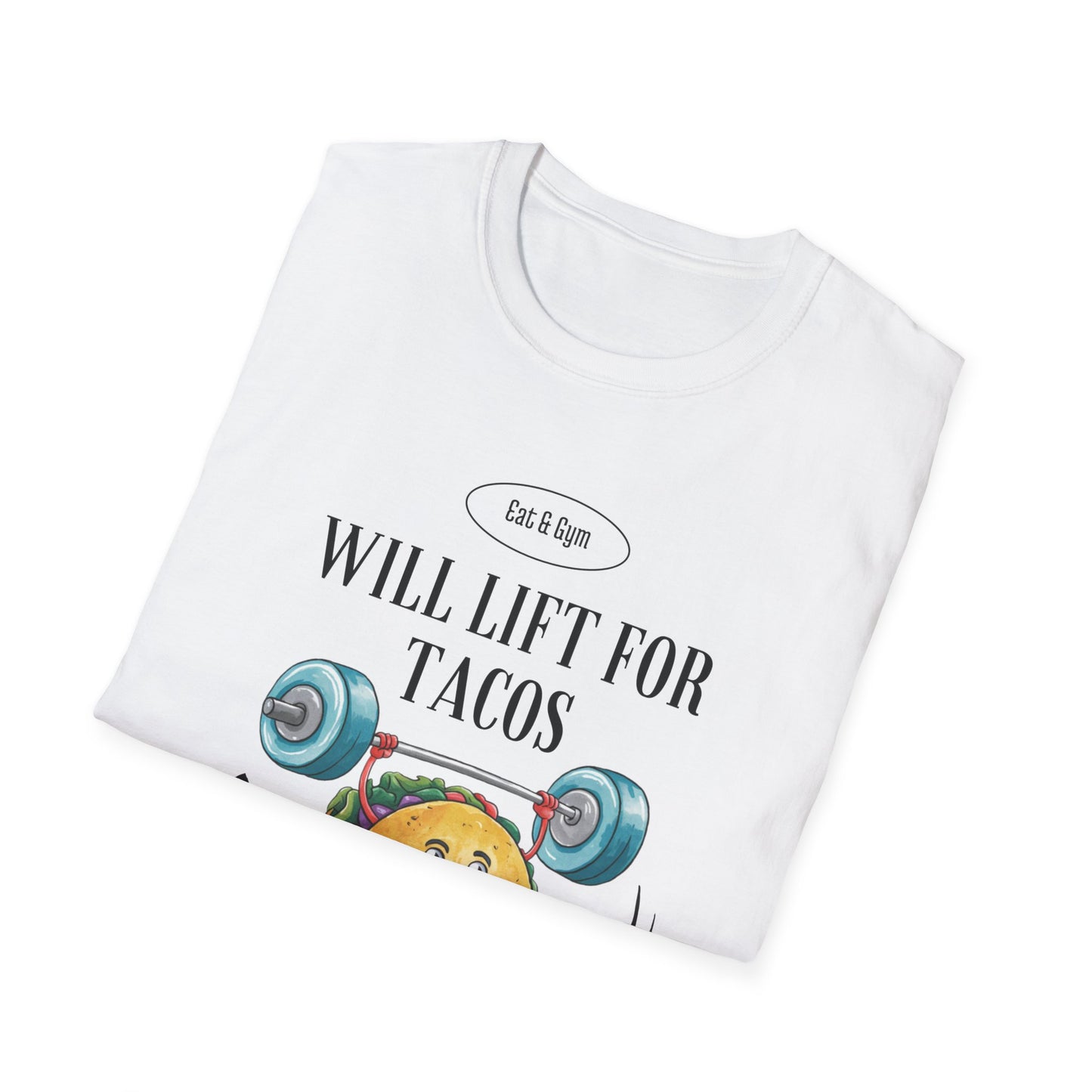 Cartoon water color gym t-shirt illustration of taco, lifting a barbell with weights.