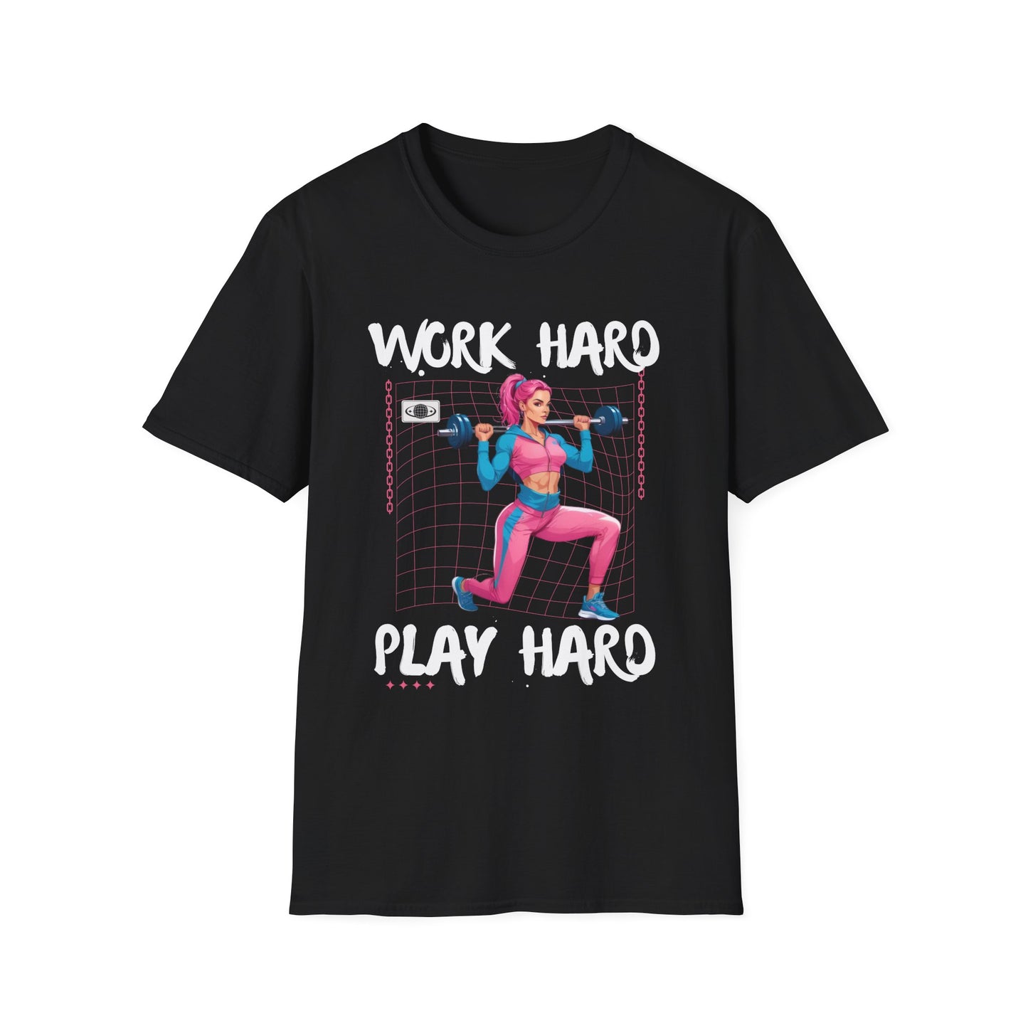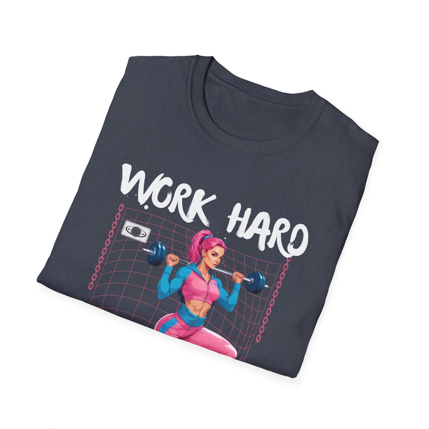Vector art gym t-shirt illustration, colors pink and blue, of a lady in a tracksuit, lifting two dumbbells.